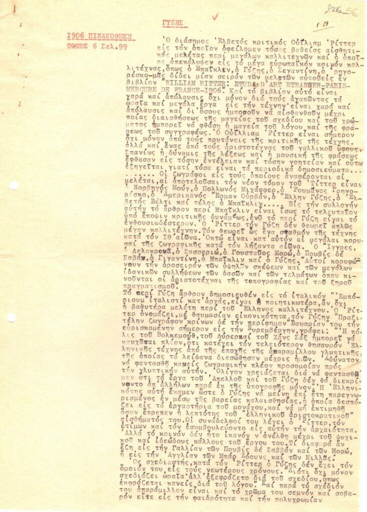 Δακτυλόγραφη αποδελτίωση κειμένων δημοσιευμένων στο περιοδικό “Πινακοθήκη”, το 1906 για τον Νικόλαο Γύζη.