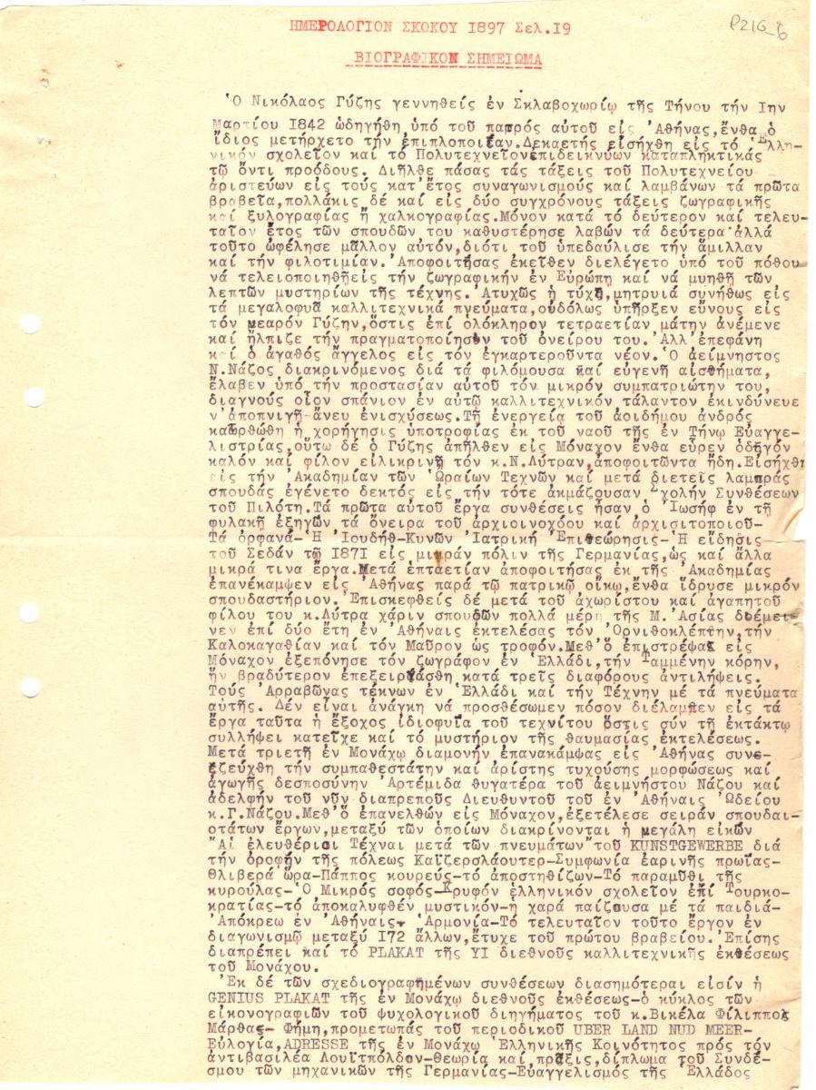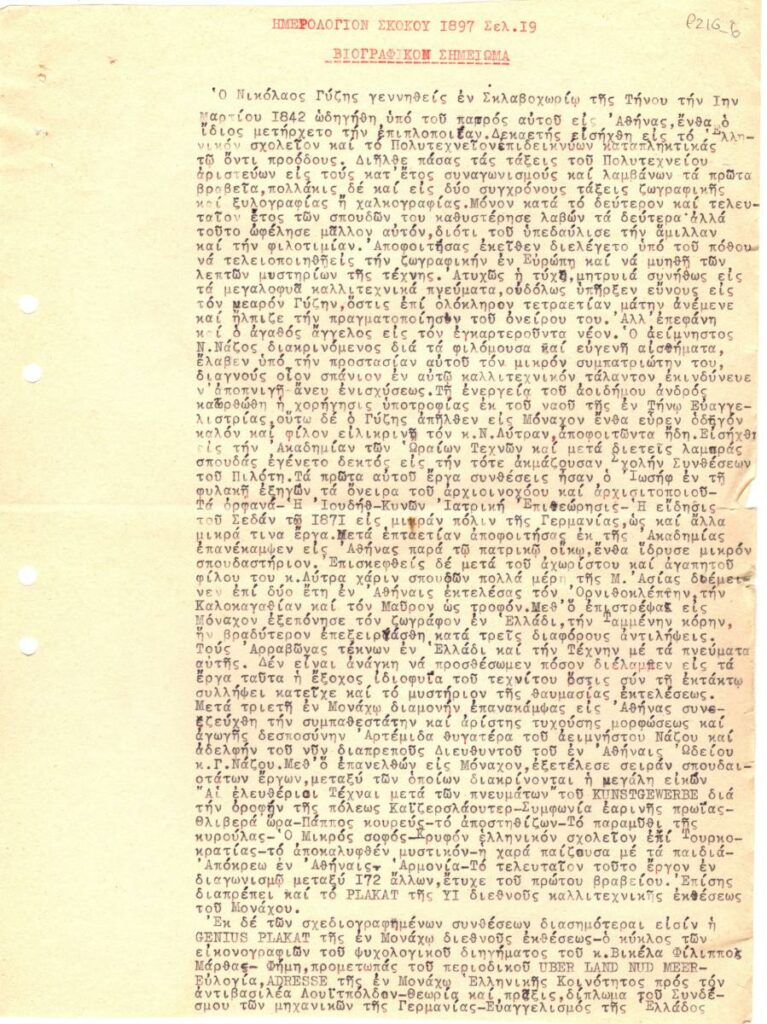 Δακτυλόγραφη αποδελτίωση βιογραφικού του Νικόλαου Γύζη, δημοσιευμένου στο Ημερολόγιο Σκόκου του έτους 1897.