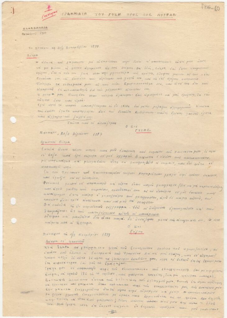 Χειρόγραφη αποδελτίωση κειμένου με τίτλο “Γράμματα του Γύζη προς τον Λύτρα”. Εμπεριέχονται επιστολές του ενός καλλιτέχνη προς τον άλλο κατά την περίοδο 1879-1899, δημοσιευμένες στο περιοδικό “Παναθήναια” το 1910.