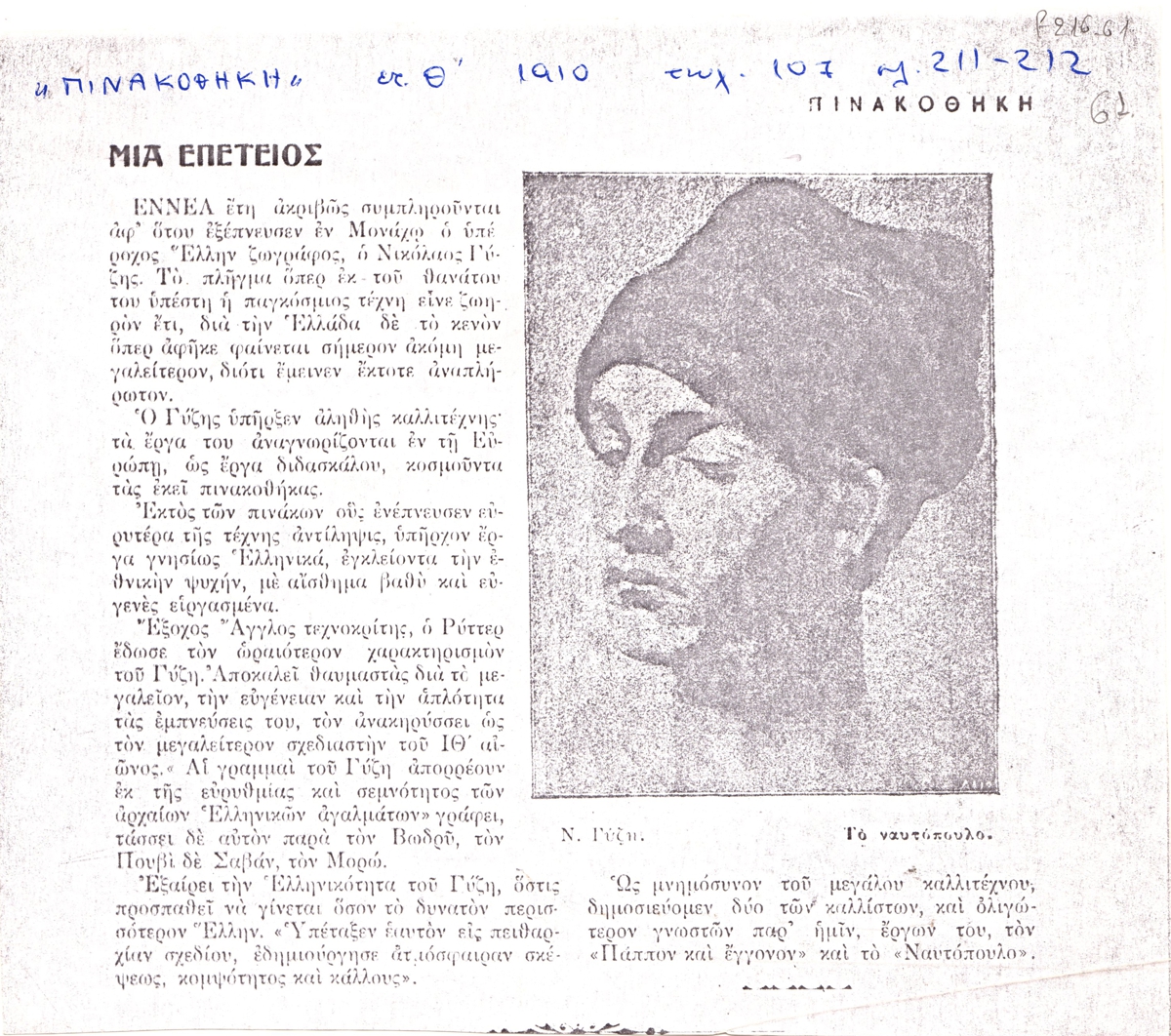 Φωτοαντίγραφο, χαρτί, 16,5×19 εκ., στα ελληνικά, δημοσίευσης άρθρου για τον Νικόλαο Γύζη, με αφορμή 9 έτη από το θάνατο του καλλιτέχνη.