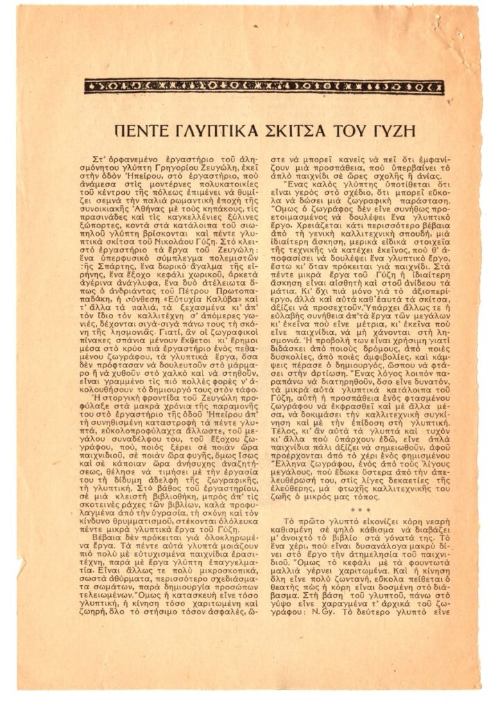 Απόκομμα του περιοδικού “Νέα Εστία” (01/12/1951) δημοσίευσης κειμένου αναφερόμενου σε έργα του Νικόλαου Γύζη.
