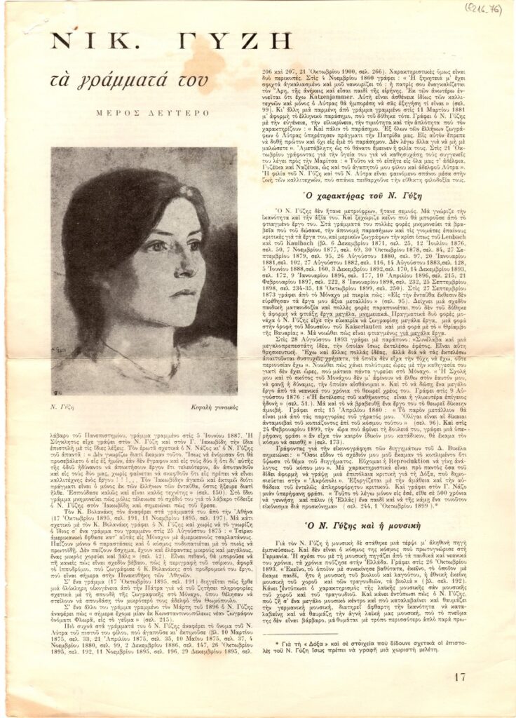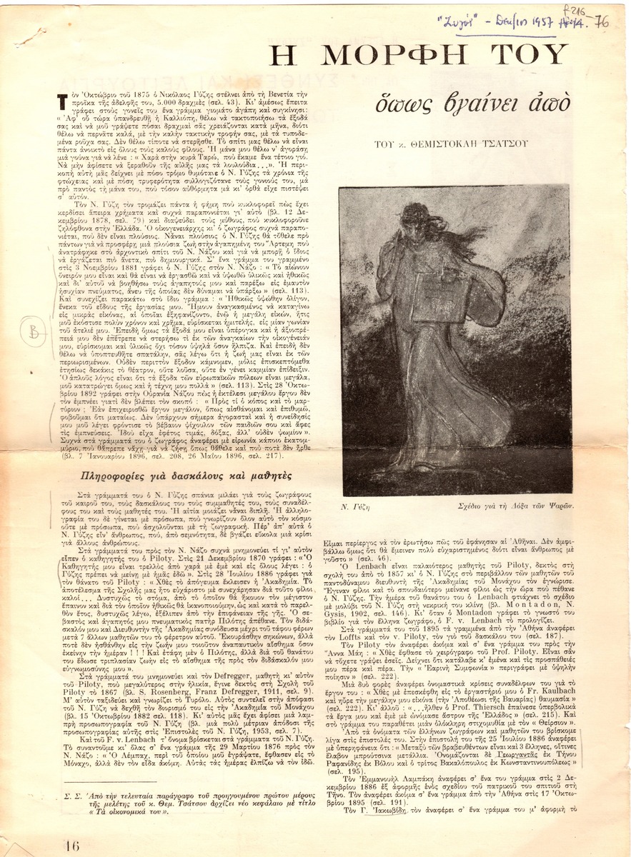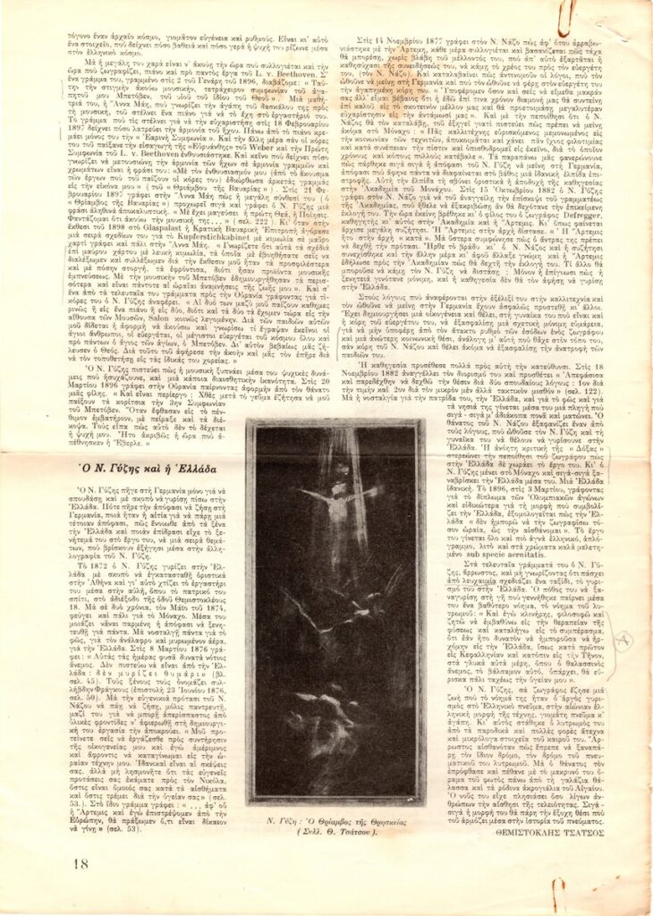 Απόκομμα του περιοδικού “Ζυγός” (12/1957) δημοσίευσης κειμένου για τον Νικόλαο Γύζη, αναφερόμενου στη ζωή του, στο χαρακτήρα του, στη σχέση με δασκάλους και μαθητές του καθώς και στις ιδέες του για τη μουσική, αλλά και στη σχέση του με την Ελλάδα, όπως απορρέουν από την αλληλογραφία του.