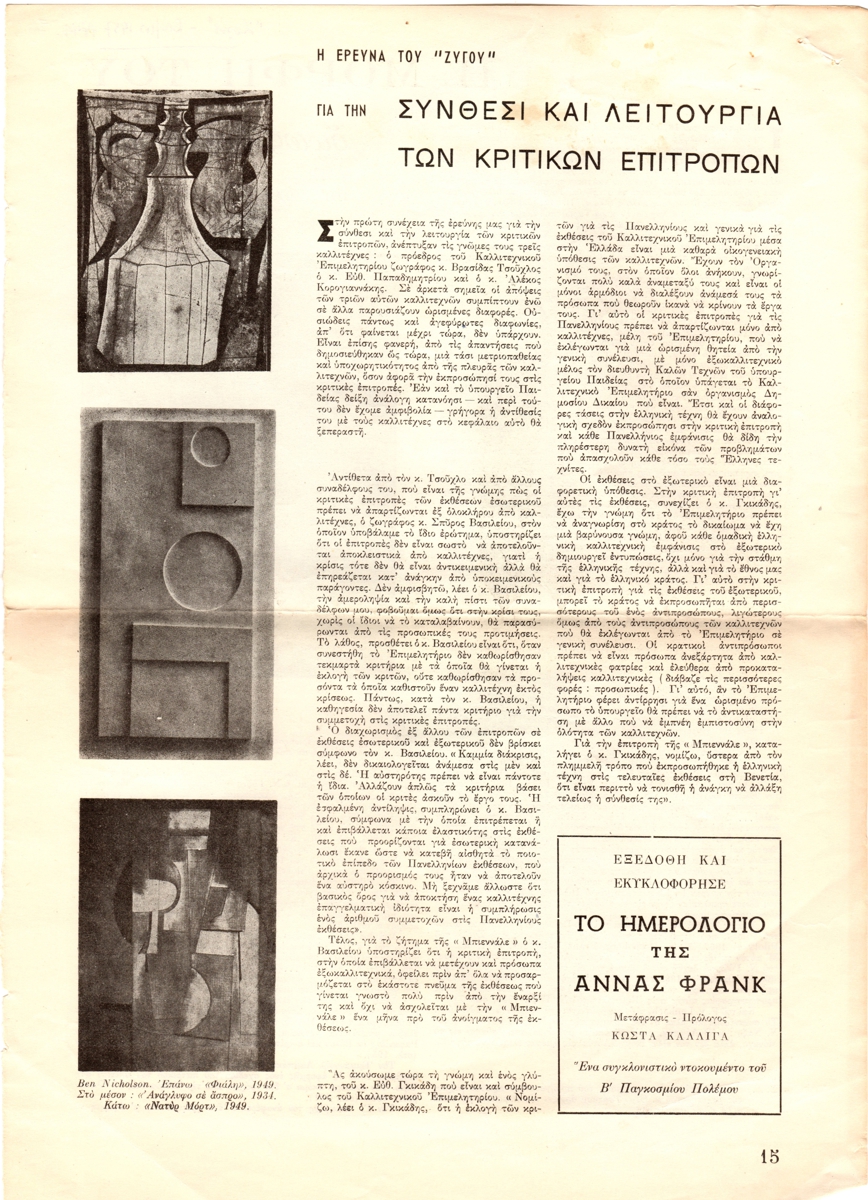 Απόκομμα, χαρτί, 34×24 εκ., στα ελληνικά, δημοσίευσης κειμένου που αναφέρεται σε έρευνα του περιοδικού Ζυγός, αναφορικά με τη λειτουργία των κριτικών επιτροπών.