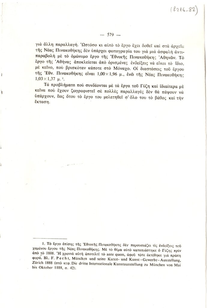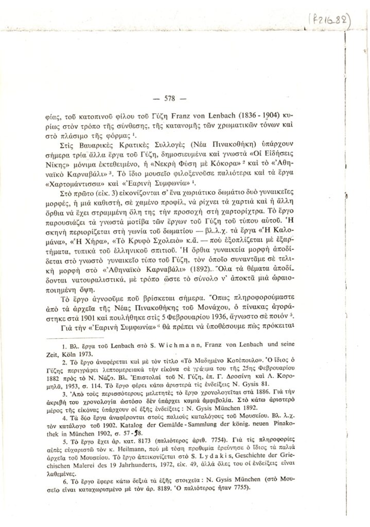 Φωτοαντίγραφο, χαρτί, 8φφ, 24×17,5 εκ., στα ελληνικά, δημοσίευσης κειμένου αναφερόμενου σε έργα του Νικόλαου Γύζη, τα οποία βρίσκονται σε συλλογές του Μονάχου.