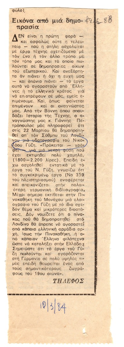 Απόκομμα εφημερίδας (10/03/1984) δημοσίευσης άρθρου αναφερόμενου σε έργο του Νικόλαου Γύζη που δημοπρατήθηκε στο Λονδίνο.