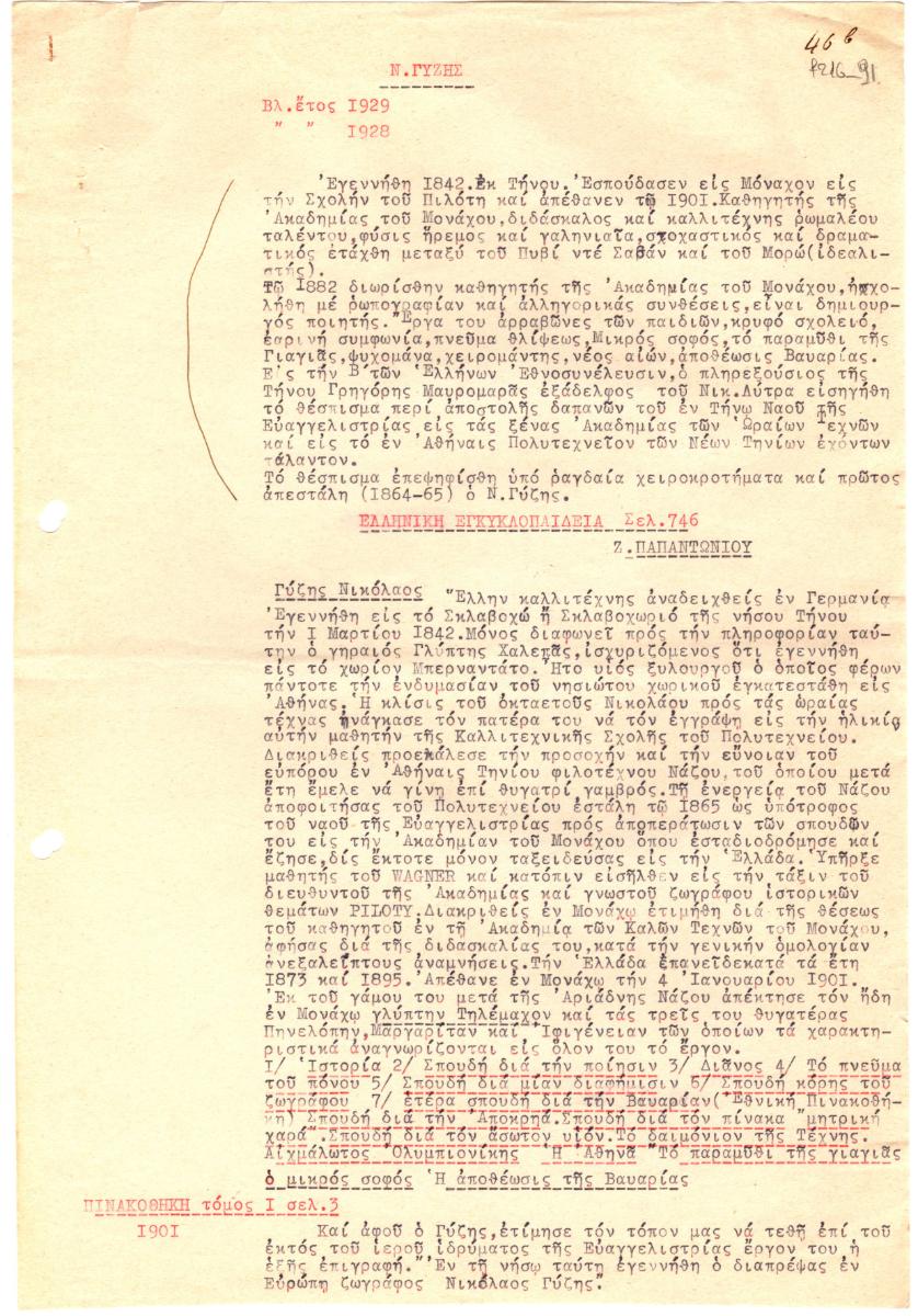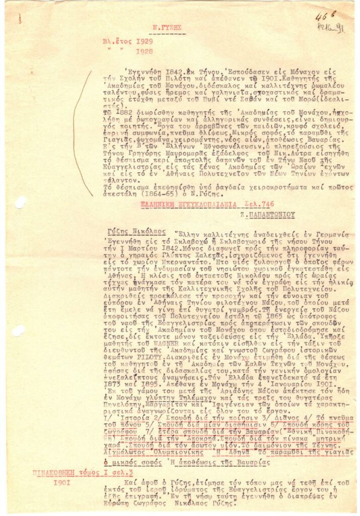 Δακτυλόγραφη αποδελτίωση πηγών για τον Νικόλαο Γύζη, της περιόδου 1901-1929.