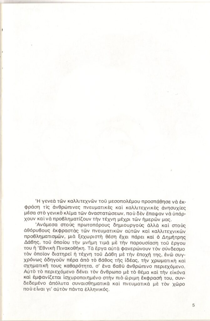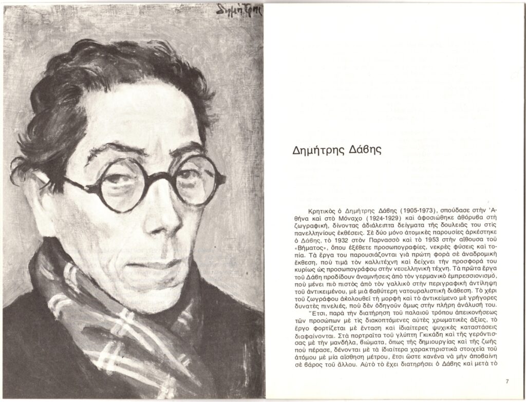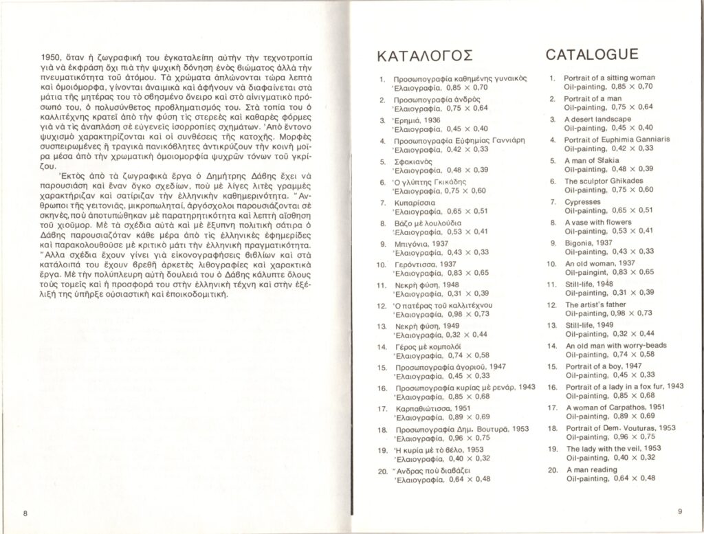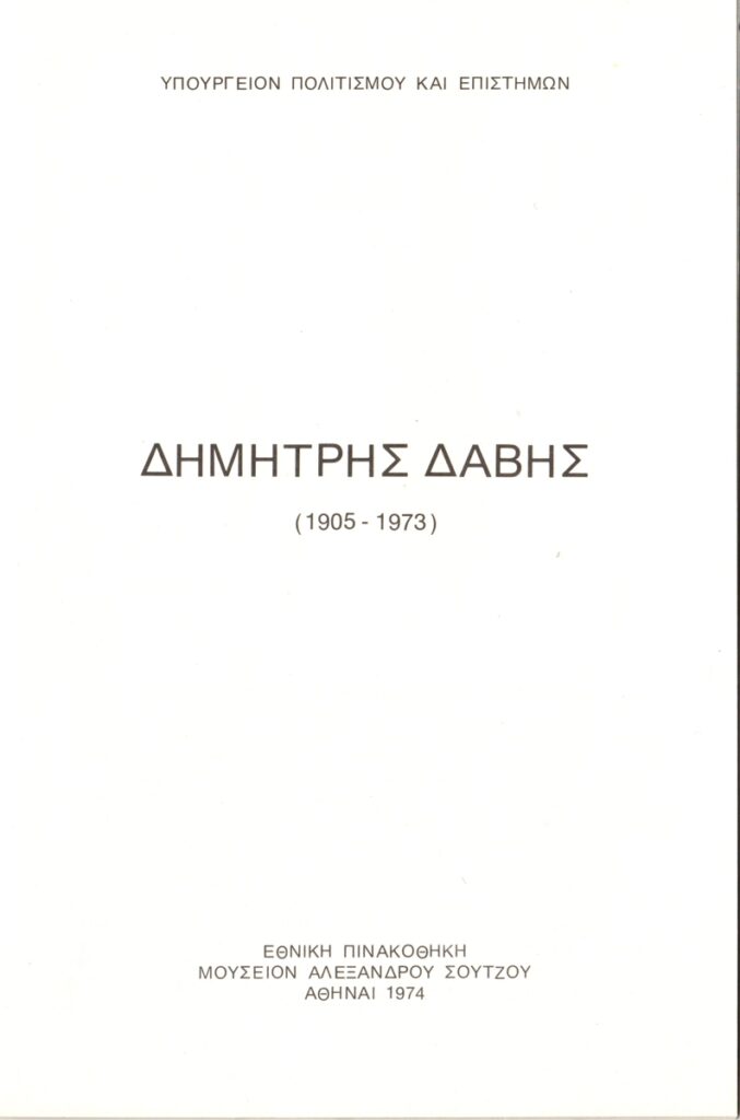 Κατάλογος, χαρτί, 9 φφ, 20,5×13,5 εκ., στα ελληνικά, αναδρομικής έκθεσης του Δημήτρη Δάβη, στην Εθνική Πινακοθήκη Αθηνών. Περιέχει κείμενο για τον καλλιτέχνη με πληροφορίες για τη ζωή και το έργο του, κατάλογο των εκτιθέμενων έργων και εικονογράφηση.