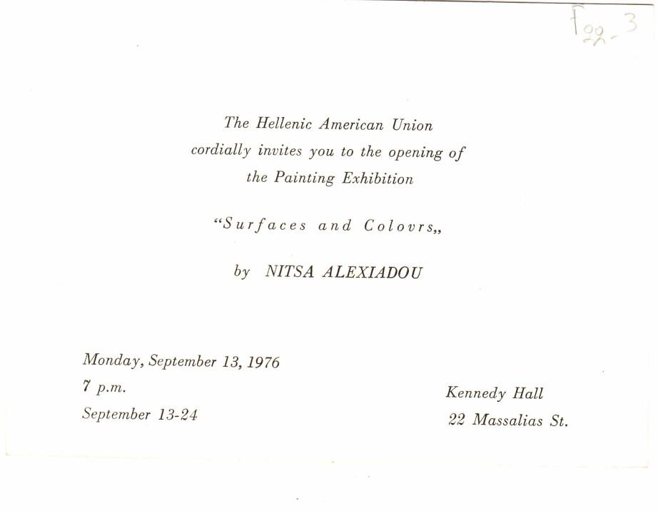 Πρόσκληση, χαρτόνι, 10,3×14,3εκ., στα ελληνικά και σε αγγλική μετάφραση έκθεσης ζωγραφικής με τίτλο “Επιφάνειες-Χρώματα” της Νίτσας Αλεξιάδου, η οποία διεξάγεται στην Ελληνοαμερικανική Ένωση.