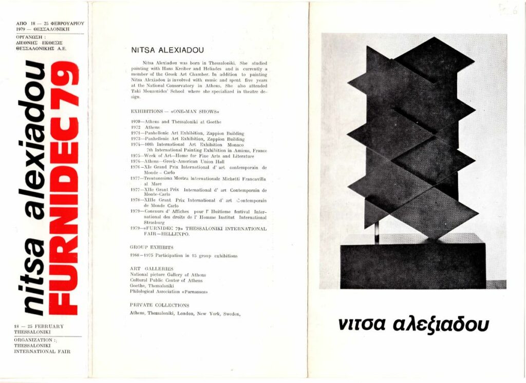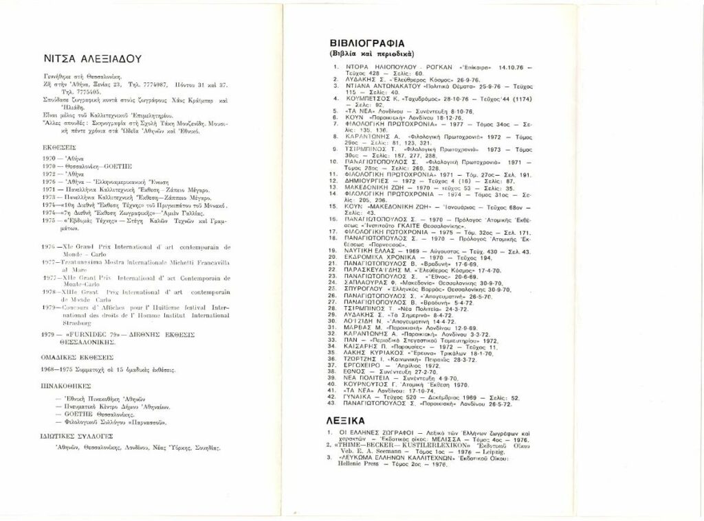 Έντυπο, τρίπτυχο, 25×14,5 εκ., στα ελληνικά και αγγλικά, έκθεσης της Νίτσας Αλεξιάδου. Περιλαμβάνει βιογραφικό σημείωμα σε ελληνικά και αγγλικά με λίστα εκθέσεων, βιβλιογραφία και λεξικά στα οποία αναφέρεται.