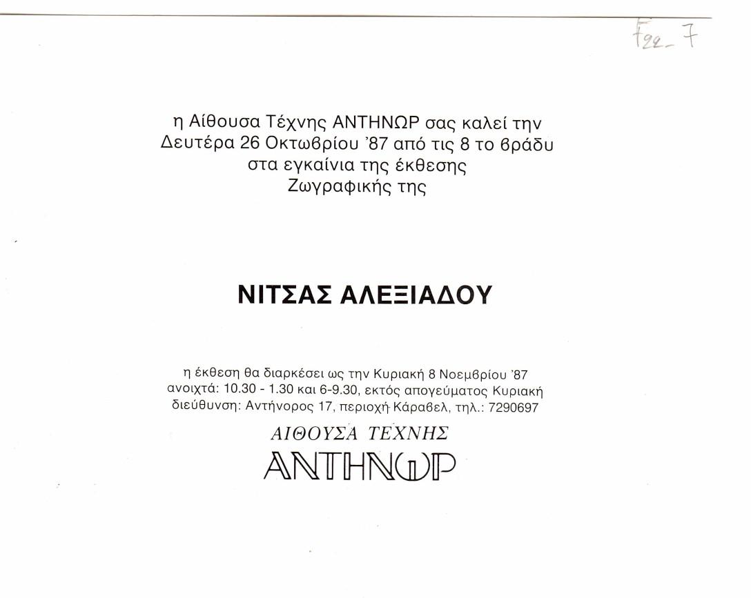 Πρόσκληση εγκαινίων έκθεσης, χαρτόνι, 11,5×16,5 εκ., στα ελληνικά, της Νίτσας Αλεξιάδου στην αίθουσα τέχνης Αντήνωρ.