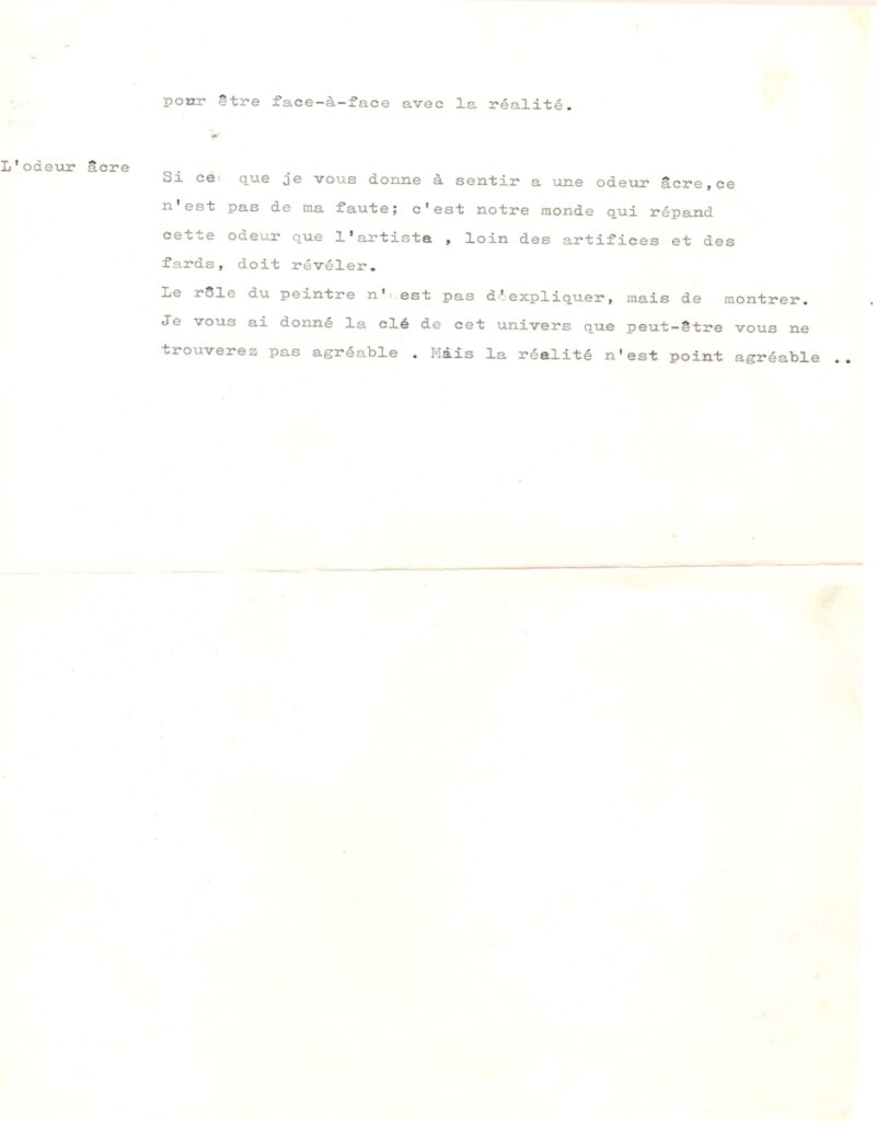 Κείμενο, δακτυλόγραφο, χαρτί, 27×21 εκ., στα γαλλικά, του Δανιήλ για την Τέχνη και το ρόλο του καλλιτέχνη.