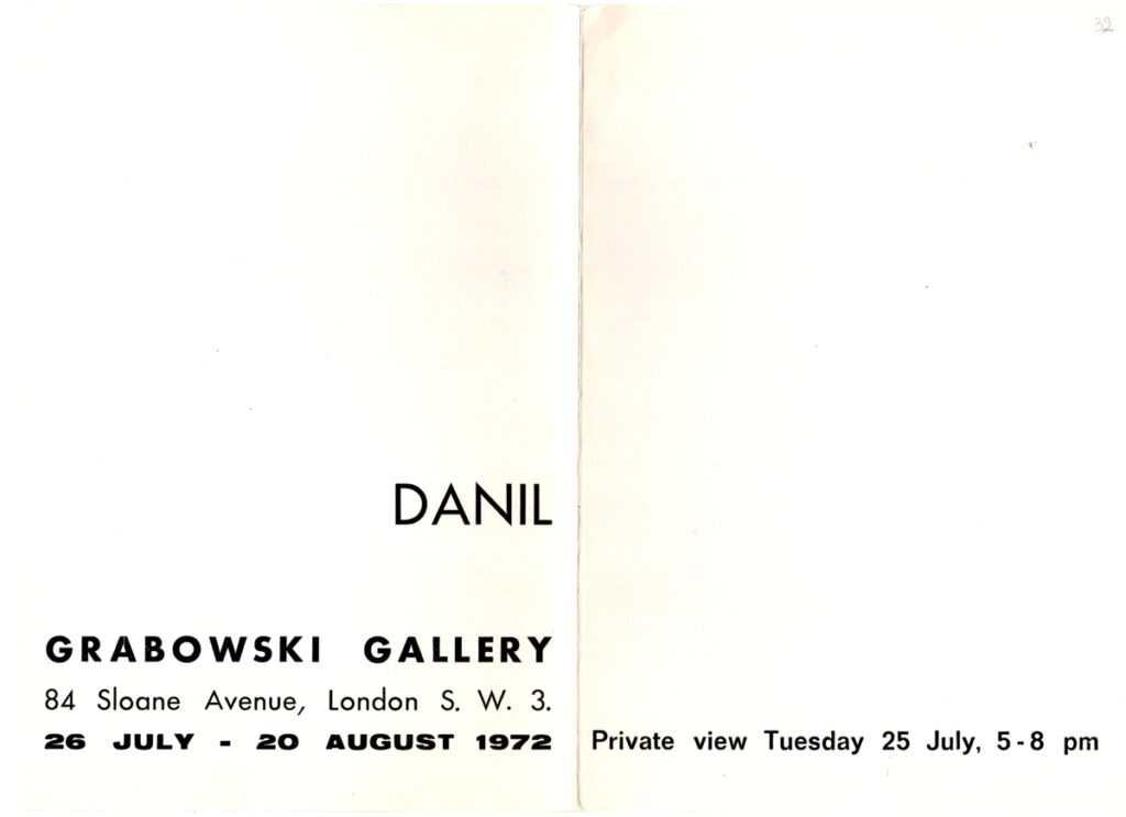 Έντυπο, χαρτί ιλλουστρασιόν, 23×16 εκ., στα αγγλικά, ατομικής έκθεσης του Δανιήλ (Παναγόπουλου) στο Λονδίνο το 1972. Στο εσωτερικό του εντύπου υπάρχουν εικονογράφηση και σύντομο βιογραφικό του καλλιτέχνη με πληροφορίες για τις ατομικές και ομαδικές του εκθέσεις.