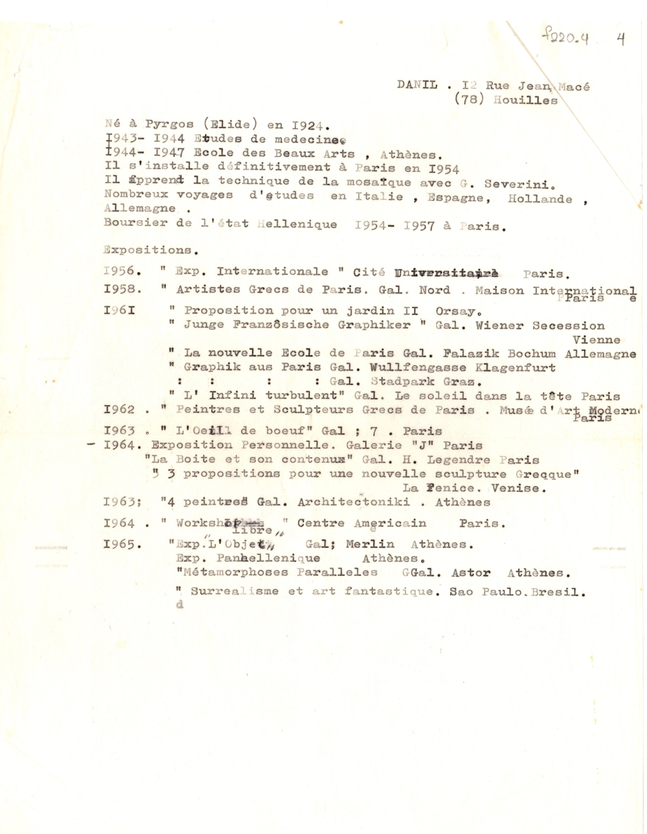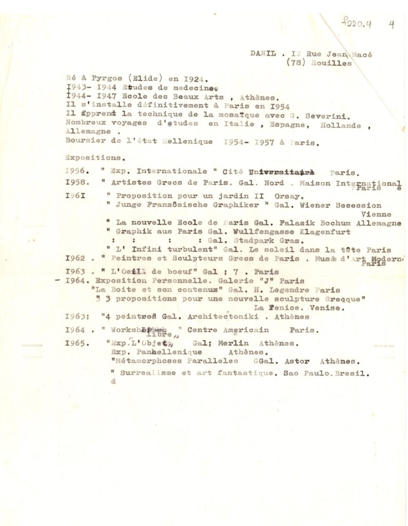 Βιογραφικό, δακτυλόγραφο, ριζόχαρτο, 27×21 εκ., στα γαλλικά, του Δανιήλ (Παναγόπουλου). Περιέχει επιγραμματικά προσωπικές πληροφορίες για τον καλλιτέχνη και λίστα εκθέσεων του.