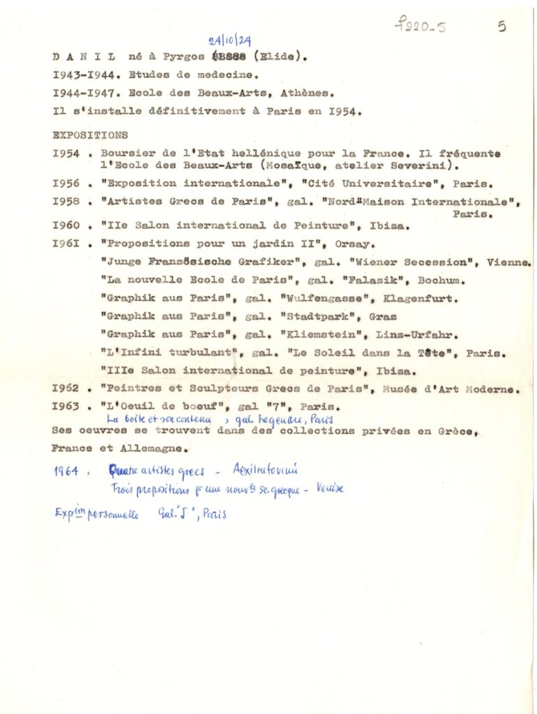 Βιογραφικό, δακτυλόγραφο, χαρτί, 27×21 εκ., στα γαλλικά, του Δανιήλ (Παναγόπουλου). Περιέχει προσωπικές πληροφορίες για τον καλλιτέχνη και λίστα εκθέσεών του.