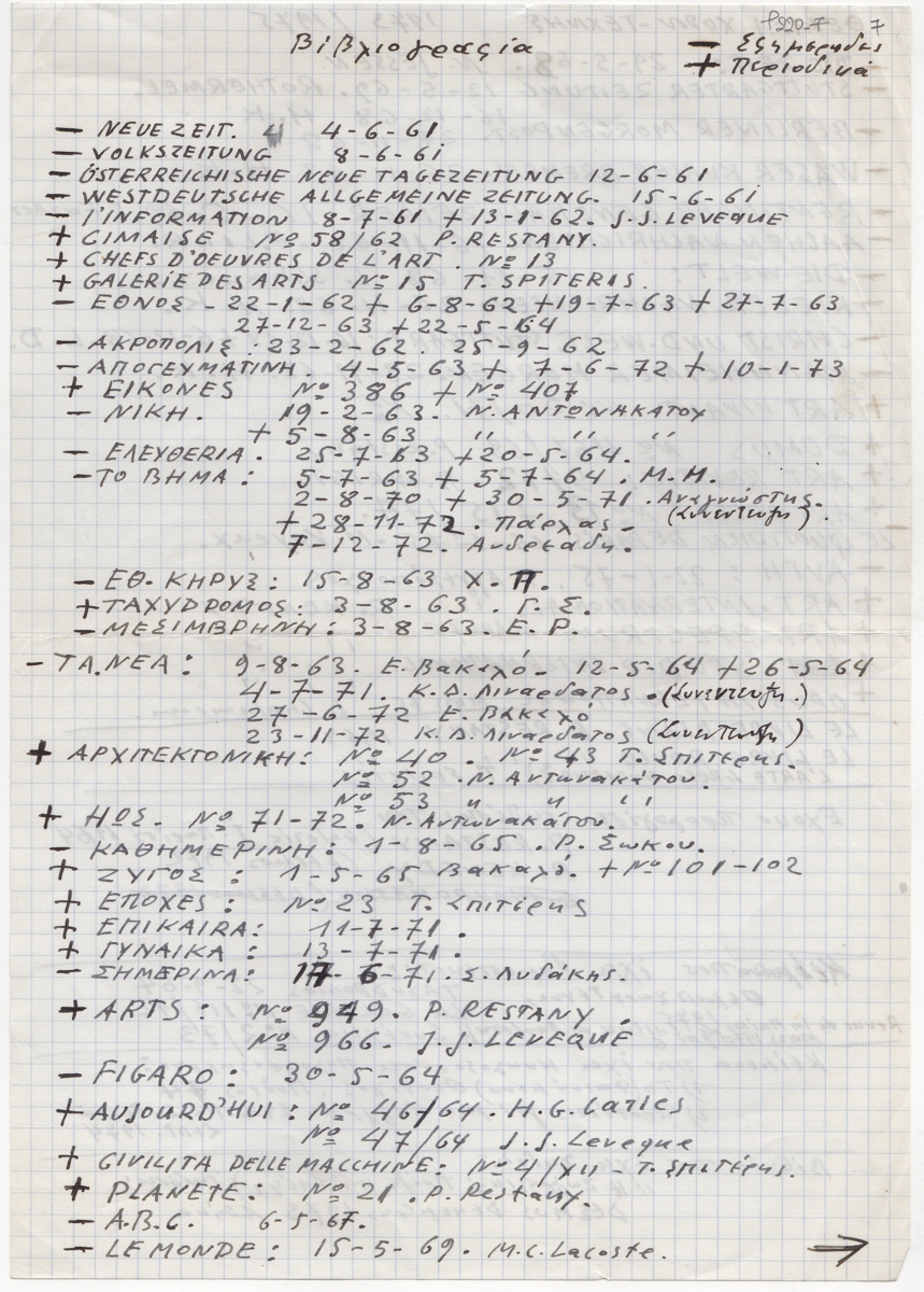 Βιβλιογραφία, χειρόγραφη, χαρτί διπλής όψεως, 29,5×21 εκ., στα ελληνικά, με λίστα δημοσιευμάτων στον ευρωπαϊκό Τύπο (εφημερίδες και περιοδικά) για τον Δανιήλ (Παναγόπουλο) κατά την περίοδο 1961-1975.
