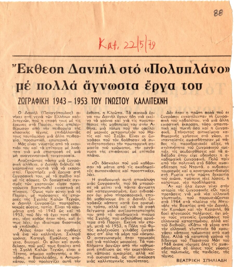Απόκομμα, χαρτί, 18×16,5 εκ., στα ελληνικά, δημοσίευσης κριτικής ατομικής έκθεσης του Δανιήλ (Παναγόπουλου), η οποία διεξάγεται στην Αίθουσα Πολύπλανο στην Αθήνα.