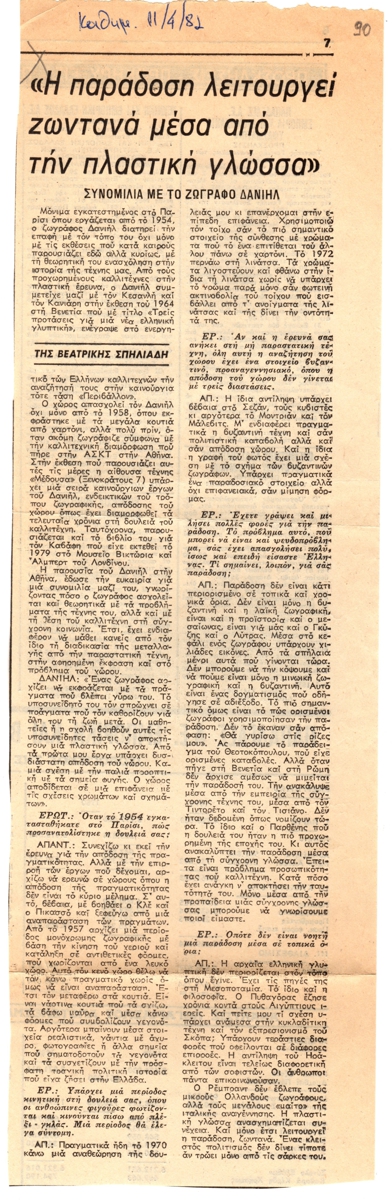 Απόκομμα, χαρτί, 38×12 εκ., στα ελληνικά, δημοσίευσης συνέντευξης και κειμένου για τον Δανιήλ (Παναγόπουλο). Ο καλλιτέχνης μιλά για το συνολικό καλλιτεχνικό του έργο. Το απόκομμα φέρει επιγραφές.