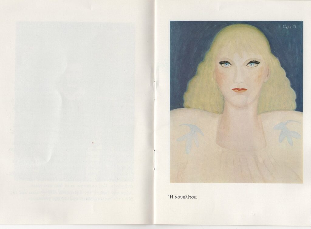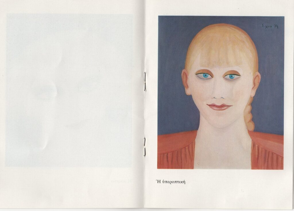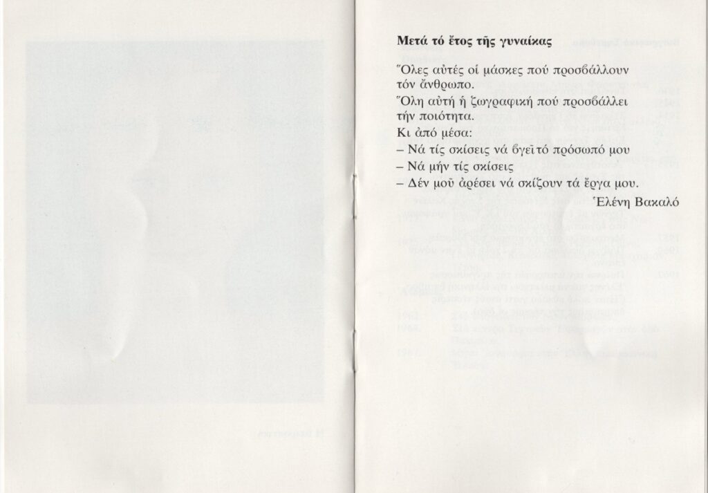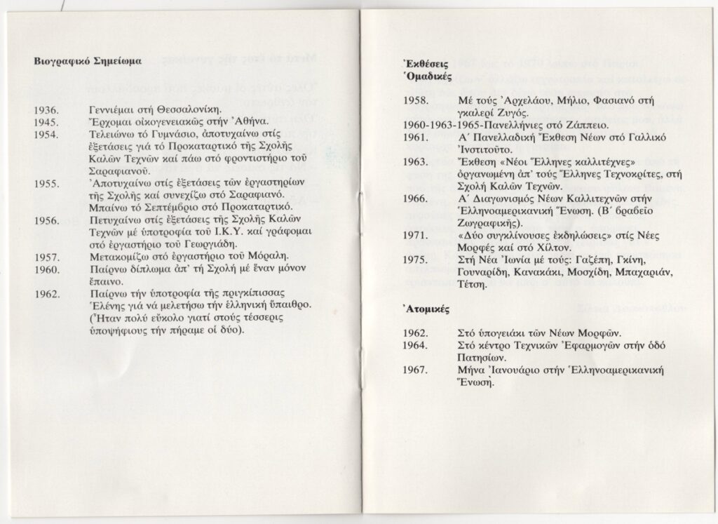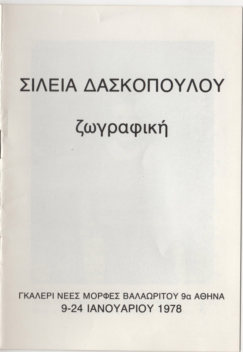Έντυπο έκθεσης, χαρτί ιλουστρασιόν, 8 φφ, 17,0×11,8 εκ., στα ελληνικά. Αφορά ατομική έκθεση της καλλιτέχνιδας στην Αθήνα το 1978. Περιέχει κείμενα της καλλιτέχνιδας και της Ελένη Βακαλό, σύντομο βιογραφικό σημείωμα, κατάλογο ομαδικών και ατομικών εκθέσεων. Εικονογραφείται με φωτογραφία και αναπαραγωγές έργων.