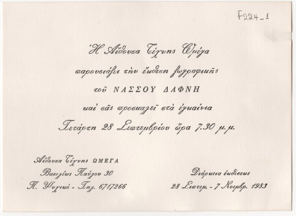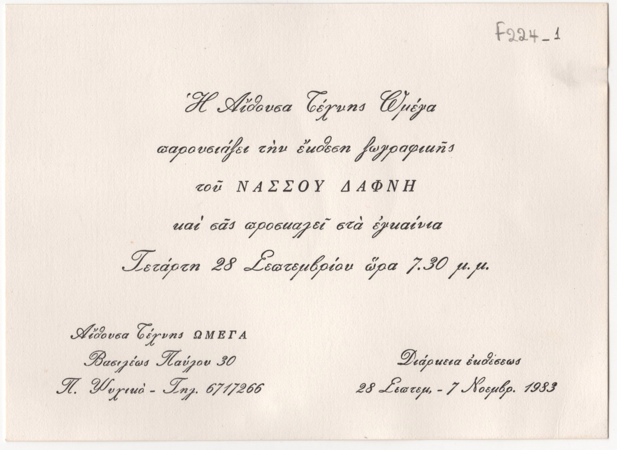 Έντυπο, μονόφυλλο, χαρτόνι, 12,0×16,5 εκ., στα ελληνικά. Αφορά ατομική έκθεση του καλλιτέχνη στην Αθήνα το 1983.