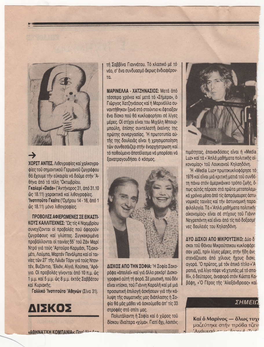 Απόκομμα περιοδικού, χαρτί, 20,0×15,2 εκ., στα ελληνικά. Αναγγελία της έκθεσης του Χορστ Άντες σε δύο γκαλερί στην Αθήνα το 1983. Εικονογραφείται με αναπαραγωγή έργου. Στο ίδιο απόκομμα δισκοπαρουσίαση: Παρουσιάζονται οι δίσκοι: “Μαρινέλλα-Χατζηνάσιος”, “Δίσκος από τη Σοφία”, “Επανεκδόσεις δίσκων του Λουκιανού Κελαηδόνη”, “Δίσκοι από Μικρούτσικο” και κριτική της ατομικής έκθεσης του Νάσσου Δάφνη στην Αθήνα.