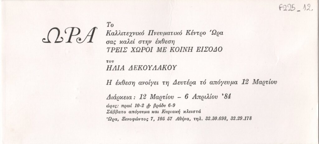 Έντυπο, μονόφυλλο, χαρτόνι, 9,0×19,7 εκ., στα ελληνικά. Αφορά ατομική έκθεση του καλλιτέχνη στην Αθήνα, το 1984.