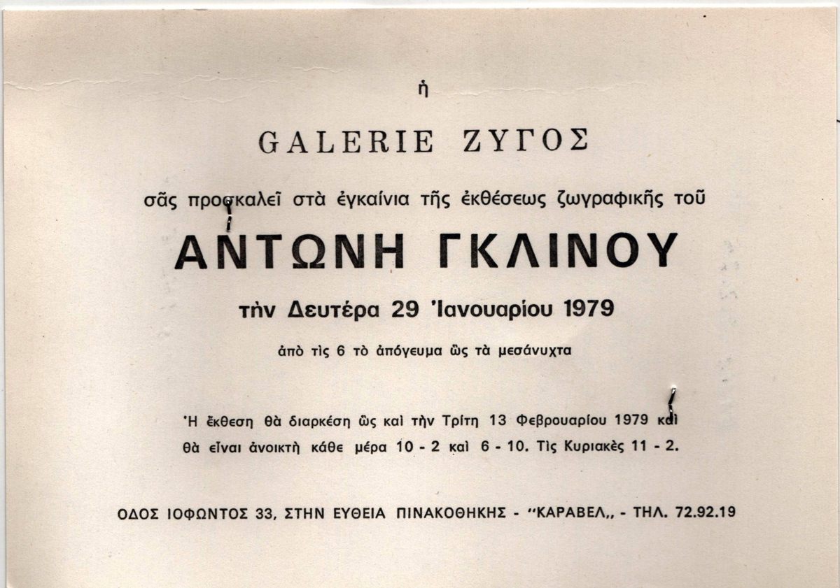 Έντυπο, μονόφυλλο, χαρτόνι, 12,0×17,0 εκ., στα ελληνικά. Αφορά ατομική έκθεση ζωγραφικής του καλλιτέχνη στην Αθήνα το 1979.