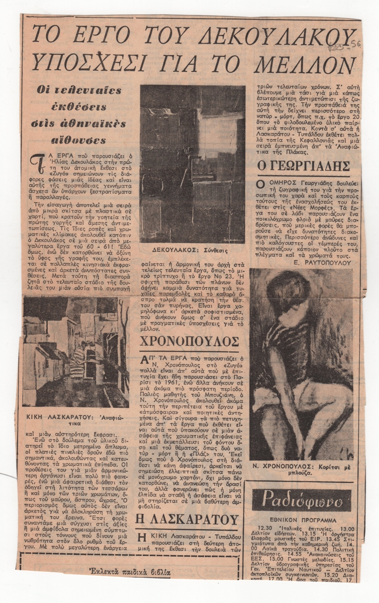 Απόκομμα εφημερίδας, χαρτί, 25,0×15,5 εκ., στα ελληνικά. Παρουσίαση τριών εκθέσεων της περιόδου: του Ηλία Δεκουλάκου στο “Ζυγό”, του Ν. Χρονόπουλου στο “Ζυγό”, της Κικής Λασκαράτου-Τυπάλδου και του Όμηρου Γεωργιάδη στις Νέες Μορφές. Εικονογραφείται με ανπαραγαγωγές έργων.