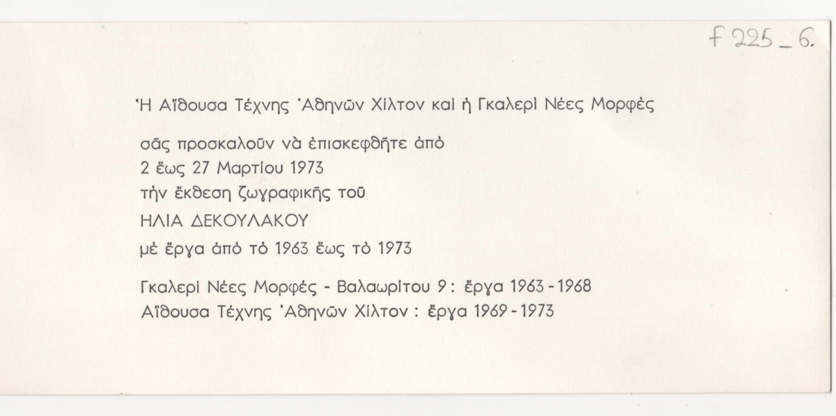 Έντυπο, μονόφυλλο, χαρτόνι, 8,0×18,0 εκ., στα ελληνικά. Αφορά ατομική έκθεση ζωγραφικής του καλλιτέχνη στην Αθήνα το 1973.