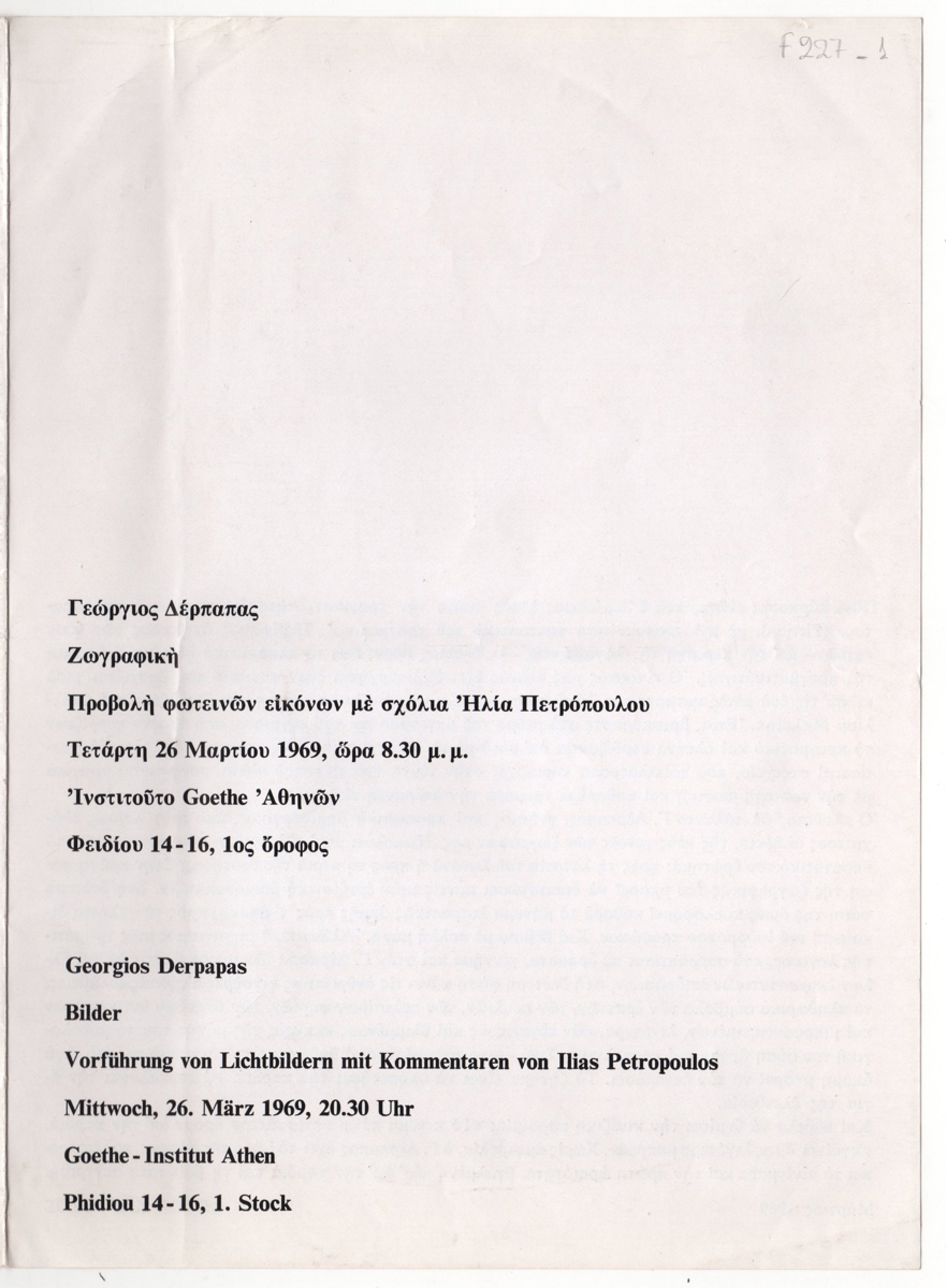Έντυπο, δίπτυχο, ιλουστρασιόν χαρτί, 24,0×17,5 εκ., στα ελληνικά και γερμανικά. Αφορά την έκθεση ζωγραφικής με προβολή φωτεινών εικόνων με σχόλια του Ηλία Πετρόπουλου που διοργανώθηκε στην Αθήνα, το 1969. Περιέχει κείμενο του Νίκου Καρούζου και αναπαραγωγή έργου.