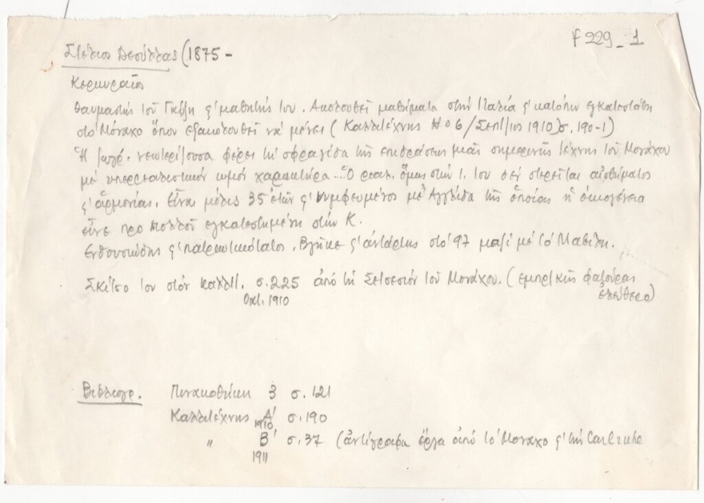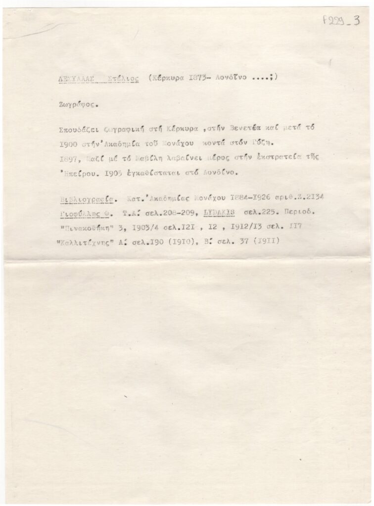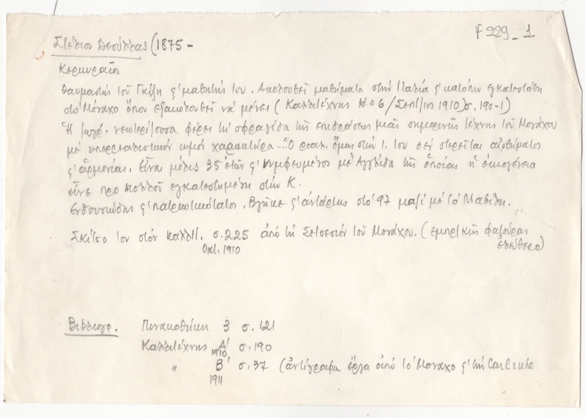 Κείμενο, χειρόγραφο, με μολύβι, σε απόκομμα χαρτιού, 14,5×21,2 εκ., στα ελληνικά. Περιέχει στοιχεία για τις σπουδές της, κριτική για το έργο του και βιβλιογραφία.