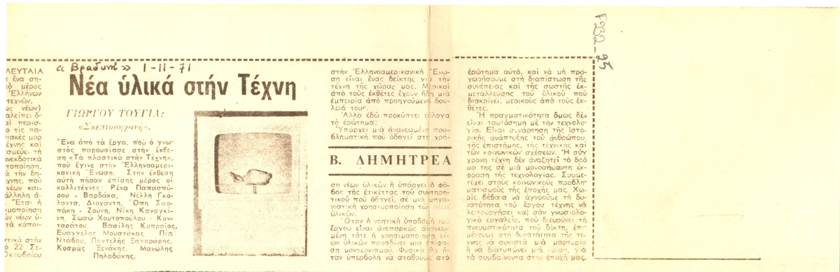 Φωτοαντίγραφο, χαρτί, 29,5×21 εκ., στα ελληνικά, δημοσίευσης κειμένου του Βαγγέλη Δημητρέα, αναφερόμενου στην ομαδική έκθεση των καλλιτέχνών: Γιώργου Τούγια, Ρένας Παπασπύρου, Νέλλης Γκολάντα, Διοχάντη, Όπης Ζούνη, Νίκης Καναγκίνη, Σωσώς Χουτοπούλου, Βασίλη Κυπραίου, Ευάγγελου Μουστάκα, Πίας Ντάβου, Παντελή Ξαγοράρη, Κοσμά Ξενάκη, Μανώλη Πηλαδάκη, με τίτλο “Τα πλαστικά στην Τέχνη”, η οποία διεξάγεται στην Ελληνοαμερικανική Ένωση, στην Αθήνα, το 1971.