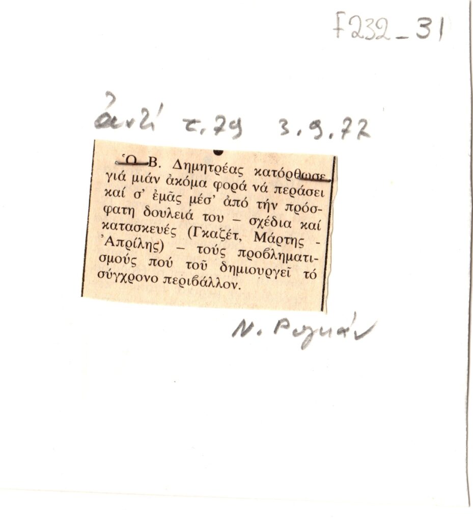 Απόκομμα, χαρτί συραμμένο σε απόκομμα εντύπου, συνολικών διαστάσεων 10×10 εκ., στα ελληνικά, δημοσίευσης σύντομης κριτικής για το έργο που παρουσιάζει ο Βαγγέλης Δημητρέας σε ατομική του έκθεση στο βιβλιοπωλείο Gazette.