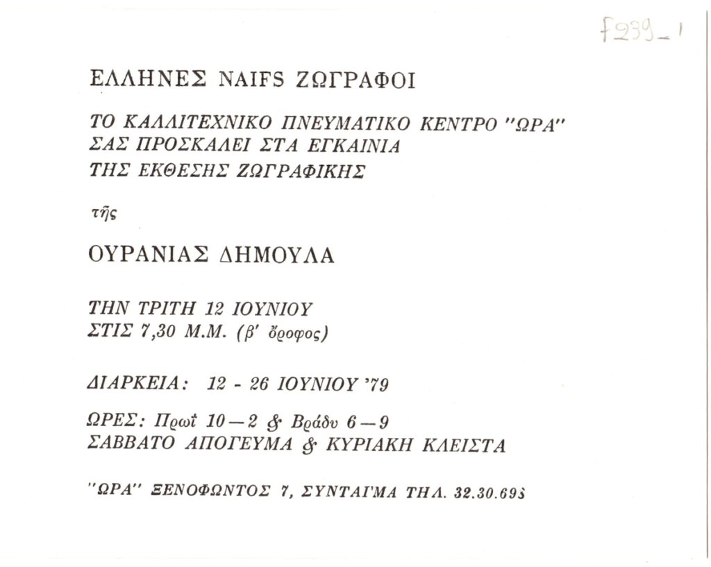 Πρόσκληση, χαρτόνι, 11×16 εκ., στα ελληνικά, ατομικής έκθεσης ζωγραφικής της Ουρανίας Δημουλά, η οποία διεξάγεται στο Καλλιτεχνικό Πνευματικό Κέντρο Ώρα, στην Αθήνα.