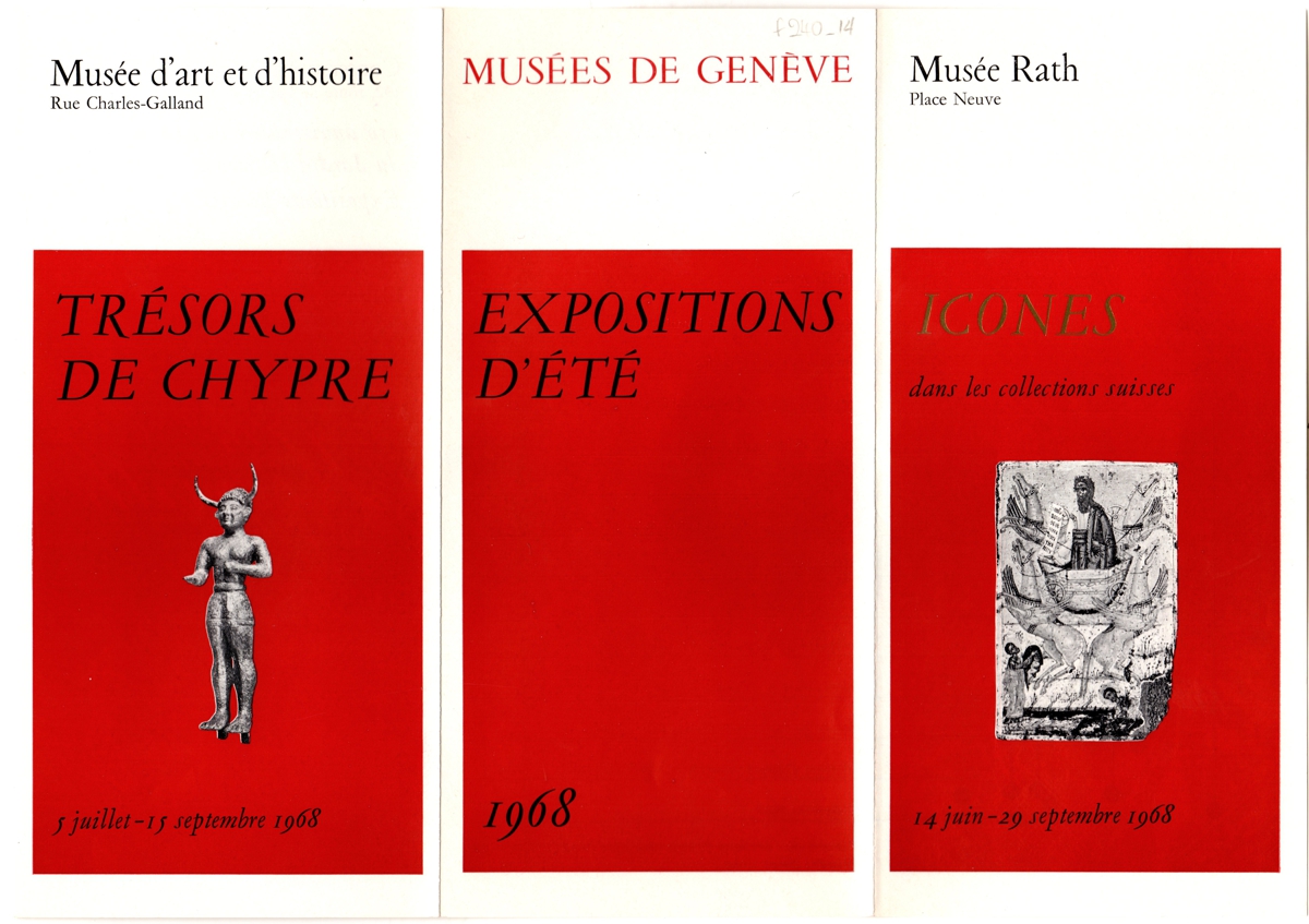 Έντυπο, χαρτί ιλλουστρασιόν τρίπτυχο, 21×10 εκ., στα γαλλικά. Περιέχει αναγγελίες εκθέσεων των Μουσείων της Γενεύης, για το καλοκαίρι 1968.
