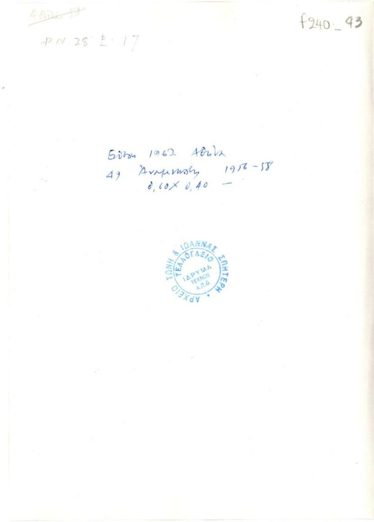 Στην πίσω όψη υπάρχει σφραγίδα του Αρχείου Τώνη και Ιωάννας Σπητέρη του Τελλογλείου Ιδρύματος Τεχνών ΑΠΘ.