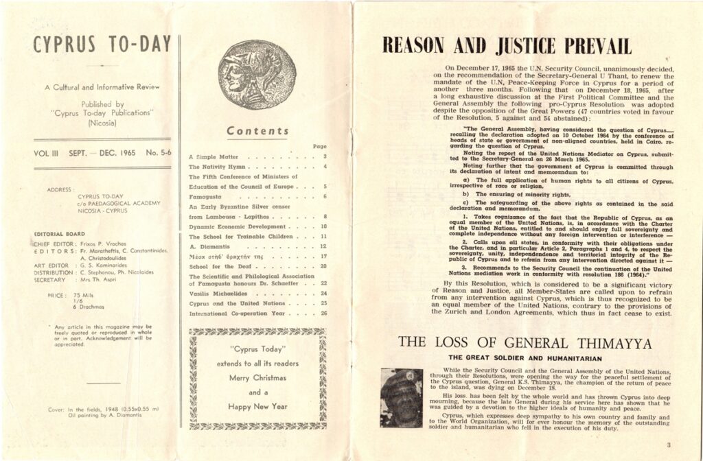 Στο τεύχος υπάρχουν άρθρα εκπαιδευτικής επικαιρότητας της Κύπρου: “The fifth conference of ministers of education of the council of Europe”, “The school for trainable children”, “School for the deaf”, πολιτικής και κοινωνικής επικαιρότητας της Κύπρου : “Reason and justice prevail”, “The loss of general Thimayya”, “Famagusta”, “Dynamic economic development”, “Cyprus and the United Nations”, “International Co-Operation year”, μουσικά αφιερώματα:”Cypriot Composers”, “The nativity hymn of the Greek Orthodox church”, πολιτιστικής επικαιρότητας : “An early byzantine silver censer from Lambousa-Lapithos”, “The scientific and philological association of Famagusta honours Dr. Schaeffer” και κυπριακής λογοτεχνίας : “Vasilis Michaelides”.