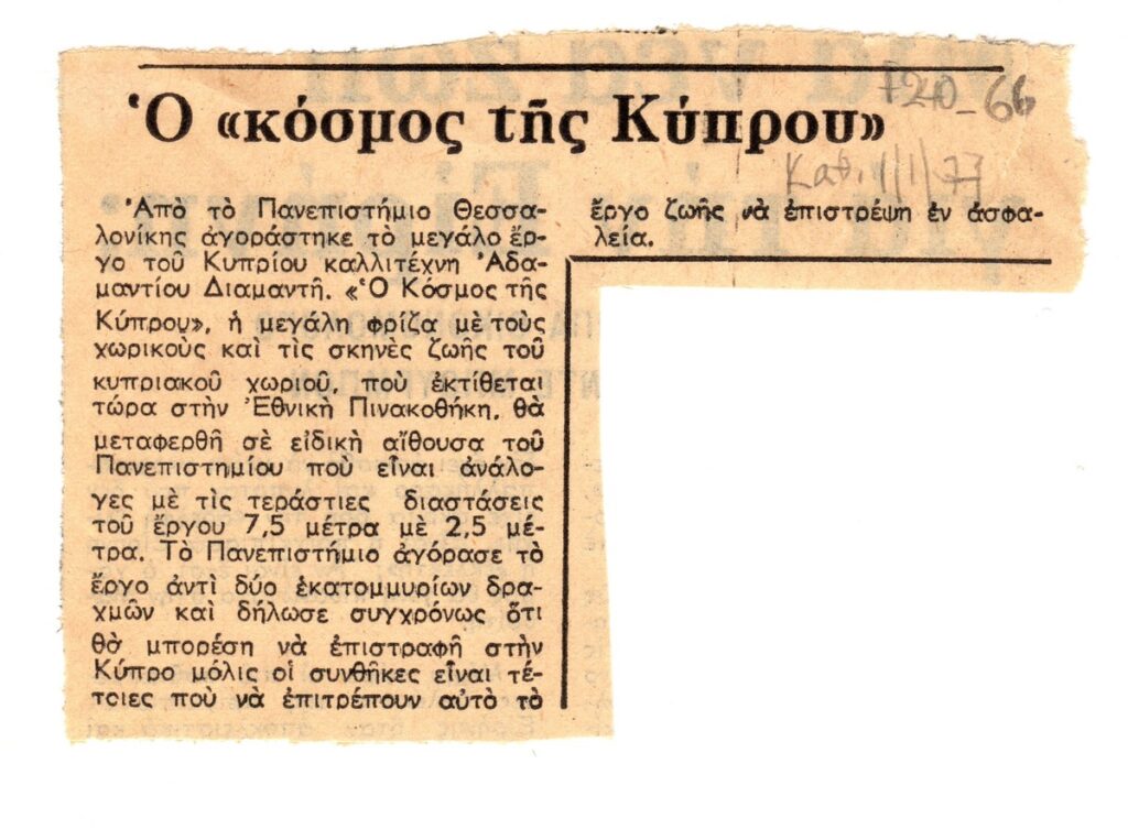 Απόκομμα της εφημερίδας “Η Καθημερινή” (01/01/1977), με αναφορά στην αγορά έργου με τίτλο “Ο Κόσμος της Κύπρου” του Διαμαντή Διαμαντή, από το Αριστοτέλειο Πανεπιστήμιο Θεσσαλονίκης.