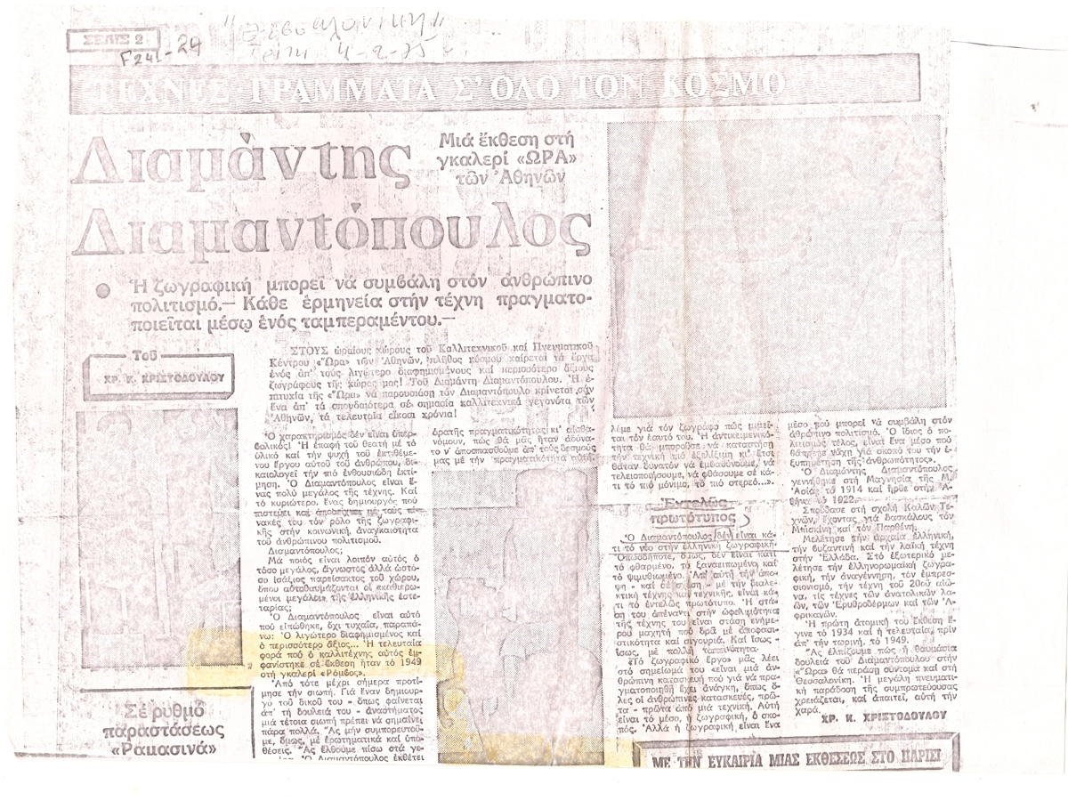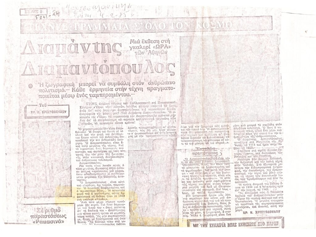 Φωτοαντίγραφο, χαρτί, 3 φφ, στα ελληνικά, δημοσίευσης άρθρου για τη ζωή και το έργο του Διαμαντή Διαμαντόπουλου, με αφορμή ατομική του έκθεση στο Καλλιτεχνικό Πνευματικό Κέντρο Ώρα στην Αθήνα το 1949.