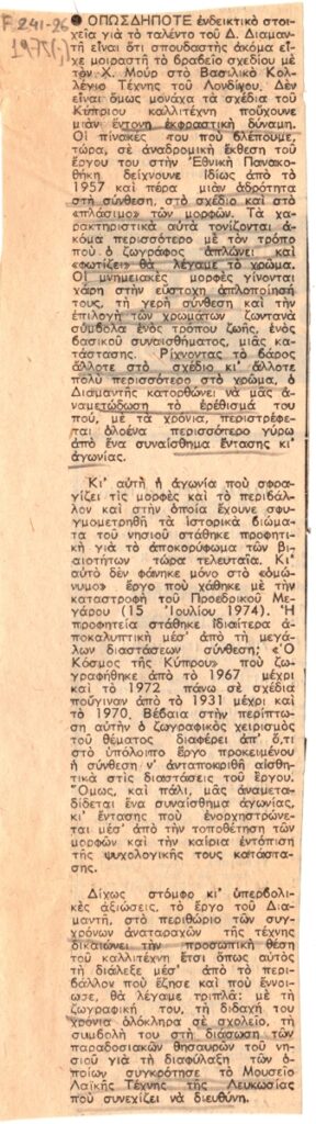 Απόκομμα, χαρτί, 23×6,5 εκ., στα ελληνικά, δημοσίευσης άρθρου για το έργο του Διαμαντή Διαμαντόπουλου.