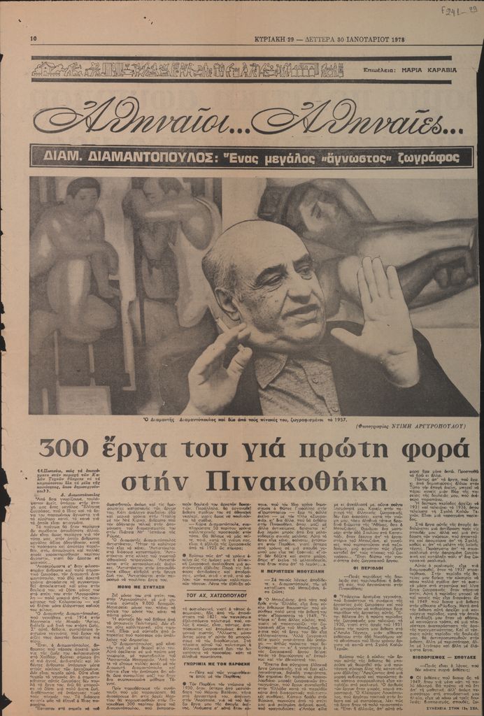 Απόκομμα, χαρτί, 2 φφ, 47.5×32 εκ., στα ελληνικά, δημοσίευσης συνέντευξης του Διαμαντή Διαμαντόπουλου. Ο ζωγράφος μιλάει για την καλλιτεχνική του πορεία, τη σχέση του με συναδέρφους, ενώ δίνει τις απόψεις του για την Τέχνη.