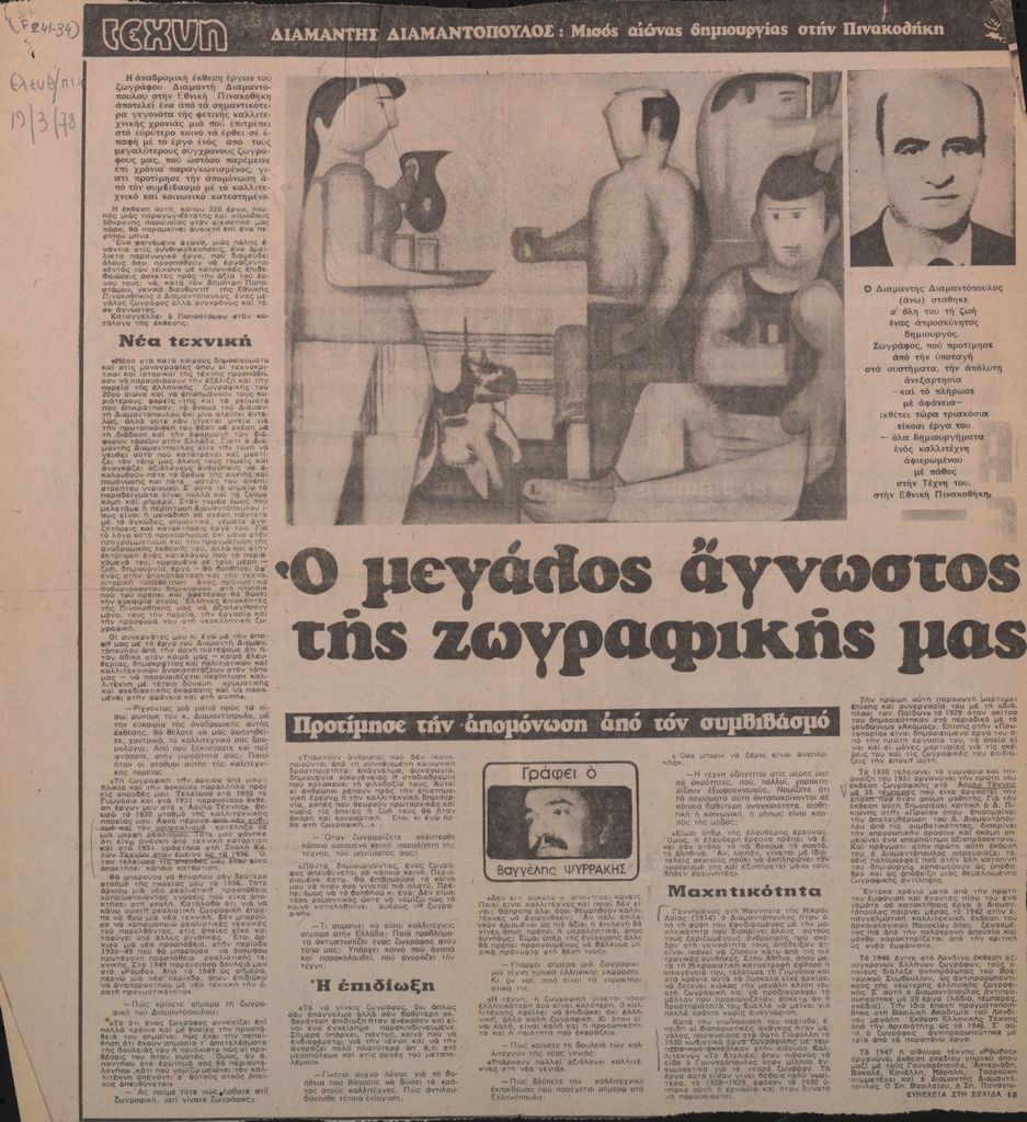 Απόκομμα, χαρτί, 2 φφ, 9×21 και 37×34,5 εκ., στα ελληνικά, δημοσίευσης άρθρου και συνέντευξης του Διαμαντή Διαμαντόπουλου. Γίνεται λόγος για το έργο και την καλλιτεχνική πορεία του ζωγράφου, με αφορμή αναδρομική του έκθεση στην Εθνική Πινακοθήκη Αθηνών.