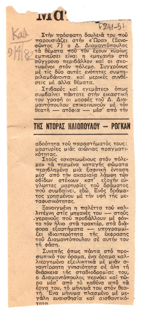 Απόκομμα, χαρτί, 14×6,5 εκ., στα ελληνικά, δημοσίευσης κριτικής έκθεσης του Διαμαντή Διαμαντόπουλου, η οποία διεξάγεται στο Καλλιτεχνικό Πνευματικό Κέντρο Ώρα στην Αθήνα, το 1982.