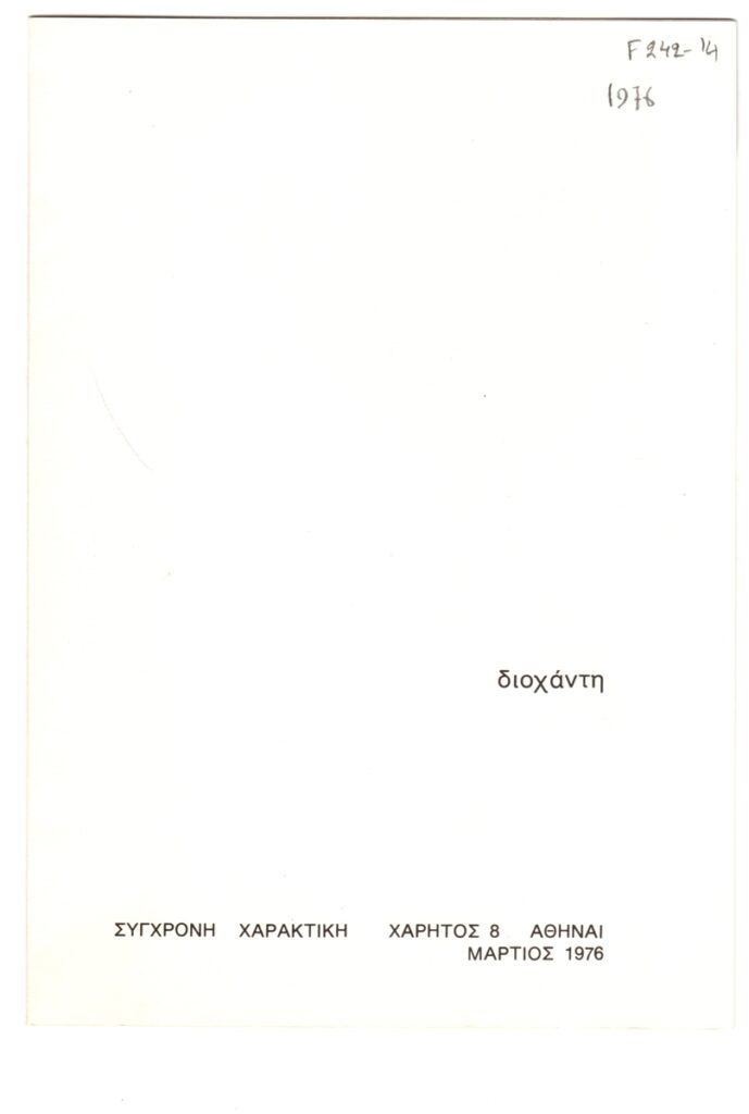 Έντυπο έκθεσης, χαρτόνι δίπτυχο, 23×16 εκ., στα ελληνικά, ατομικής έκθεσης μεταξοτυπίας της Διοχάντη (Λουμίδη), η οποία διεξάγεται στην γκαλερί Σύγχρονη Χαρακτική στην Αθήνα τον Μάρτιο 1976. Εικονογραφείται και περιέχει βιογραφικό της καλλιτέχνιδας σε ελληνικά και αγγλικά.