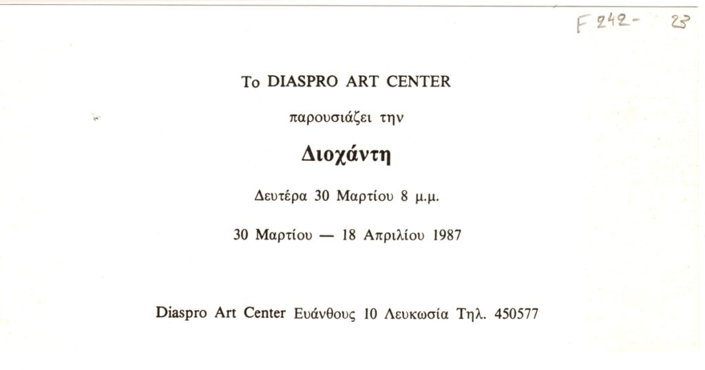 Πρόσκληση, χαρτόνι, 10×20 εκ., στα ελληνικά, ατομικής έκθεσης της Διοχάντη (Λουμίδη), στο Diaspro Art Center, το 1987.
