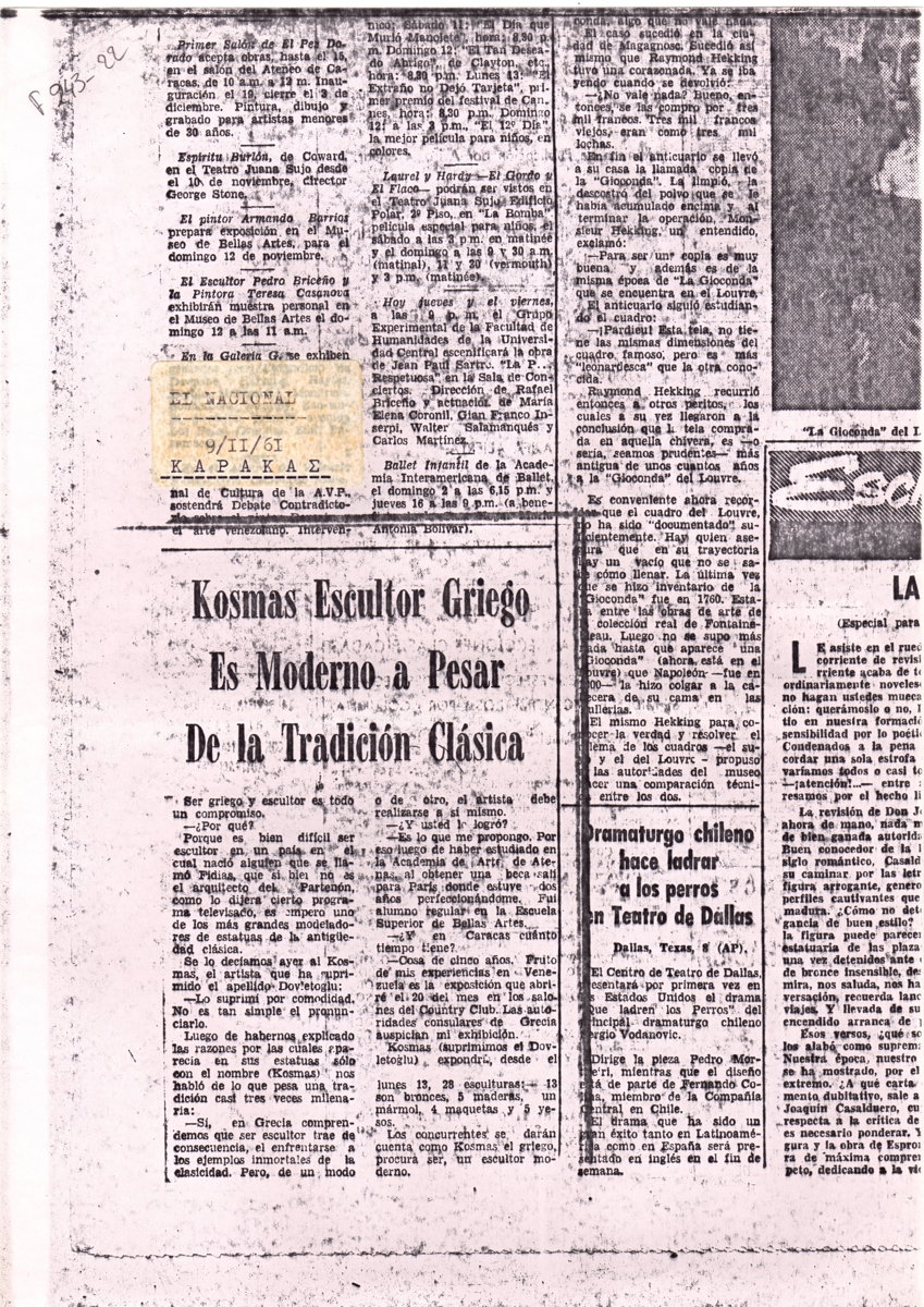 Φωτοαντίγραφο, χαρτί, 29,5×21 εκ., στα ισπανικά, με κείμενο για τον Κοσμά Δοβλέτογλου και το έργο του, με αφορμή ατομική έκθεση γλυπτικής στο Καράκας το 1961.