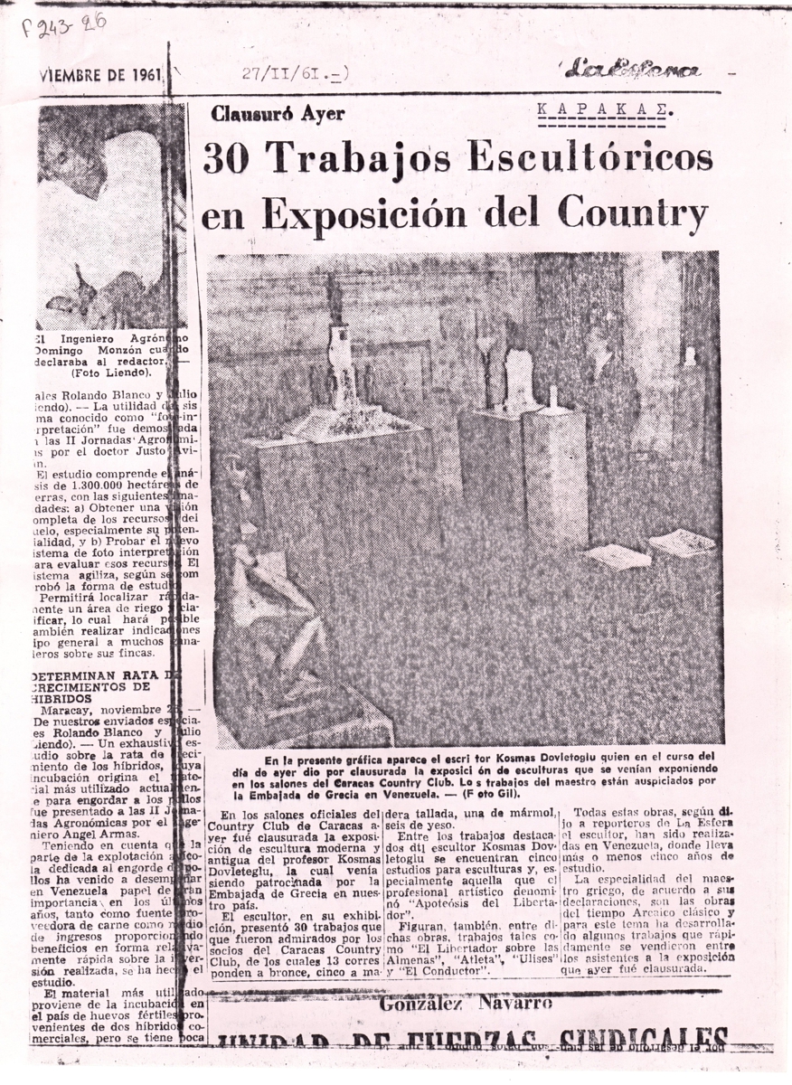Φωτοαντίγραφο, χαρτί, 28×21 εκ., στα ισπανικά, δημοσίευσης κριτικής έκθεσης του Κοσμά Δοβλέτογλου, η οποία διεξάγεται στο Country Club στο Καράκας.