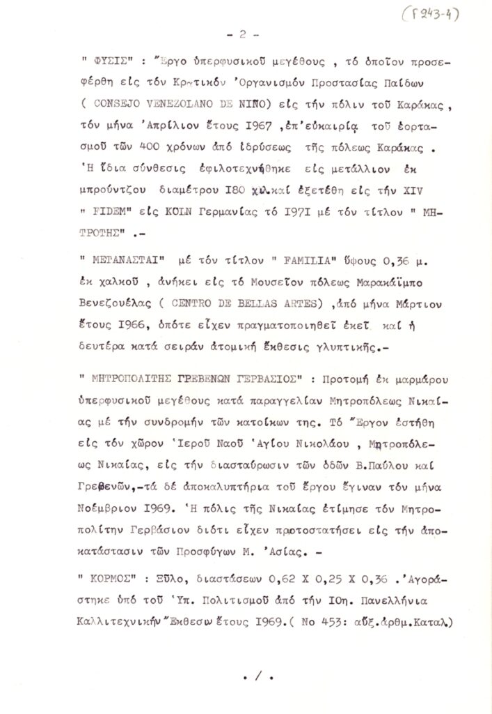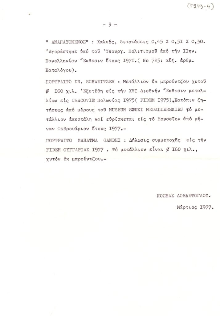Δακτυλόγραφο, χαρτί, 3 φφ, 29,5×21 εκ., στα ελληνικά, με λίστα γλυπτών του Κοσμά Δοβλέτογλου. Δίνονται πληροφορίες για το καθένα απ’ τα έργα.