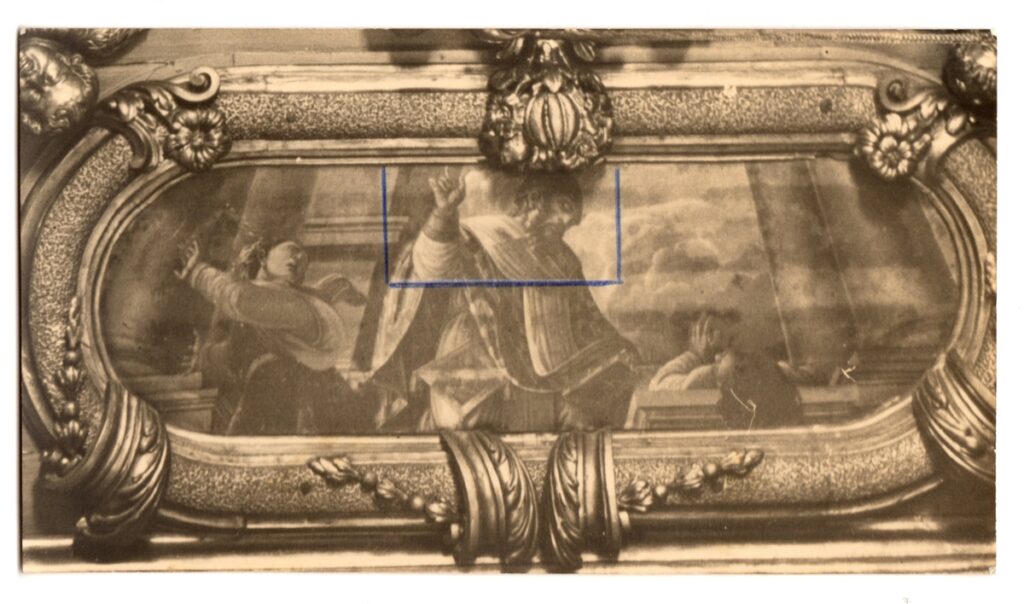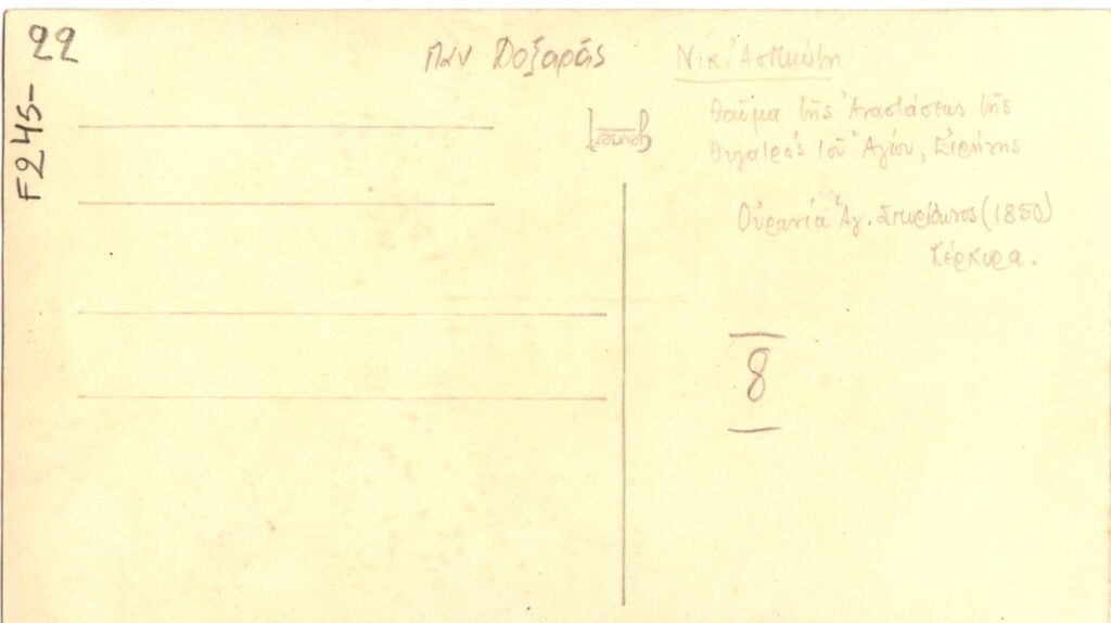 Φωτογραφική αναπαραγωγή έργου, α/μ, σε ταχυδρομική κάρτα, χαρτόνι, 8×14 εκ. Πρόκειται για αντιγραφή θρησκευτικού έργου του Παναγιώτη Δοξαρά, στον Ιερό Ναό Αγίου Σπυρίδωνα στην Κέρκυρα, από τον Νικόλαο Ασπιώτη.