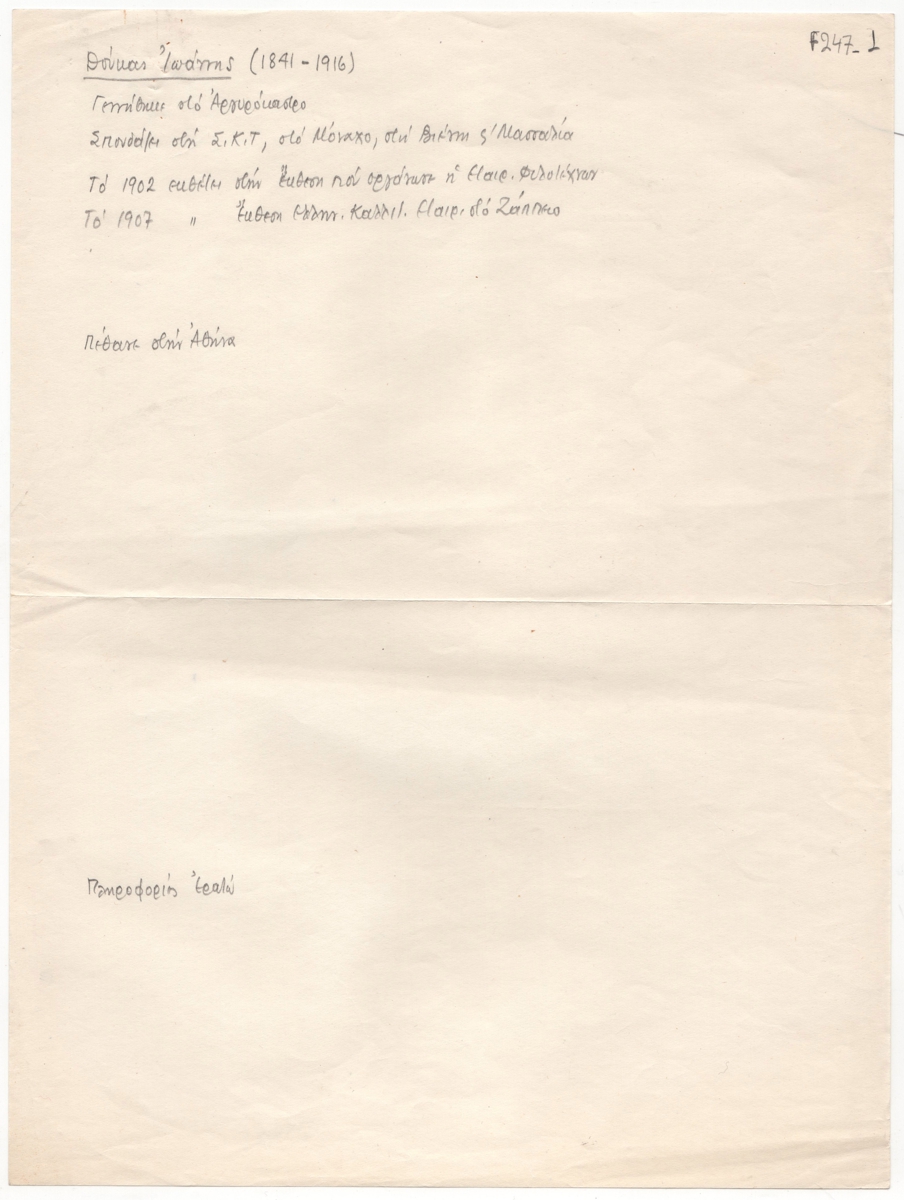 Κείμενο, χειρόγραφο, με μολύβι, 28,5×21,2 εκ., στα ελληνικά. Αναφέρονται σπουδές και κατάλογος εκθέσεων μέχρι το 1907.