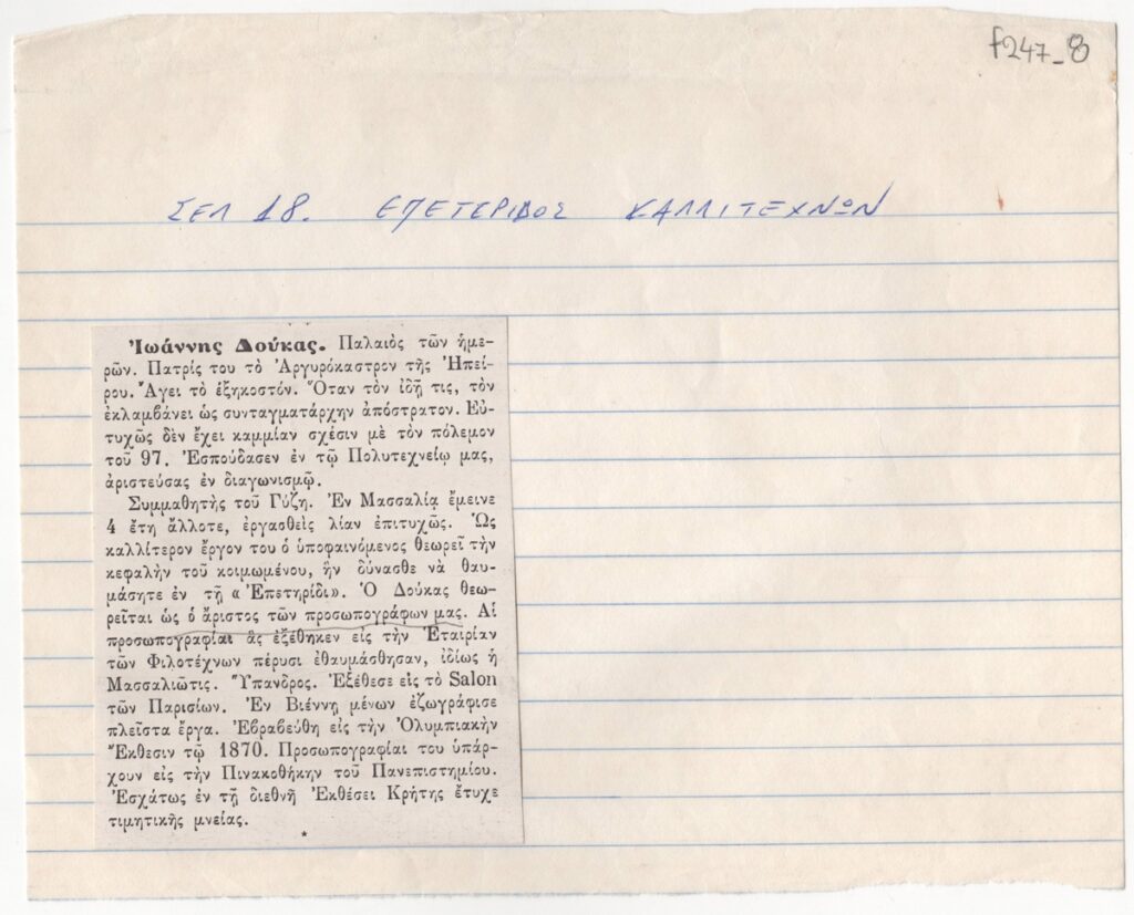 Φωτοαντίγραφο αποκόμματος εντύπου, χαρτί, 10,5×8,0 εκ., στα ελληνικά. Επικολημμένο σε απόκομμα χαρτιού, 16,5×20,5 εκ., όπου υπάρχει επιγραφή.